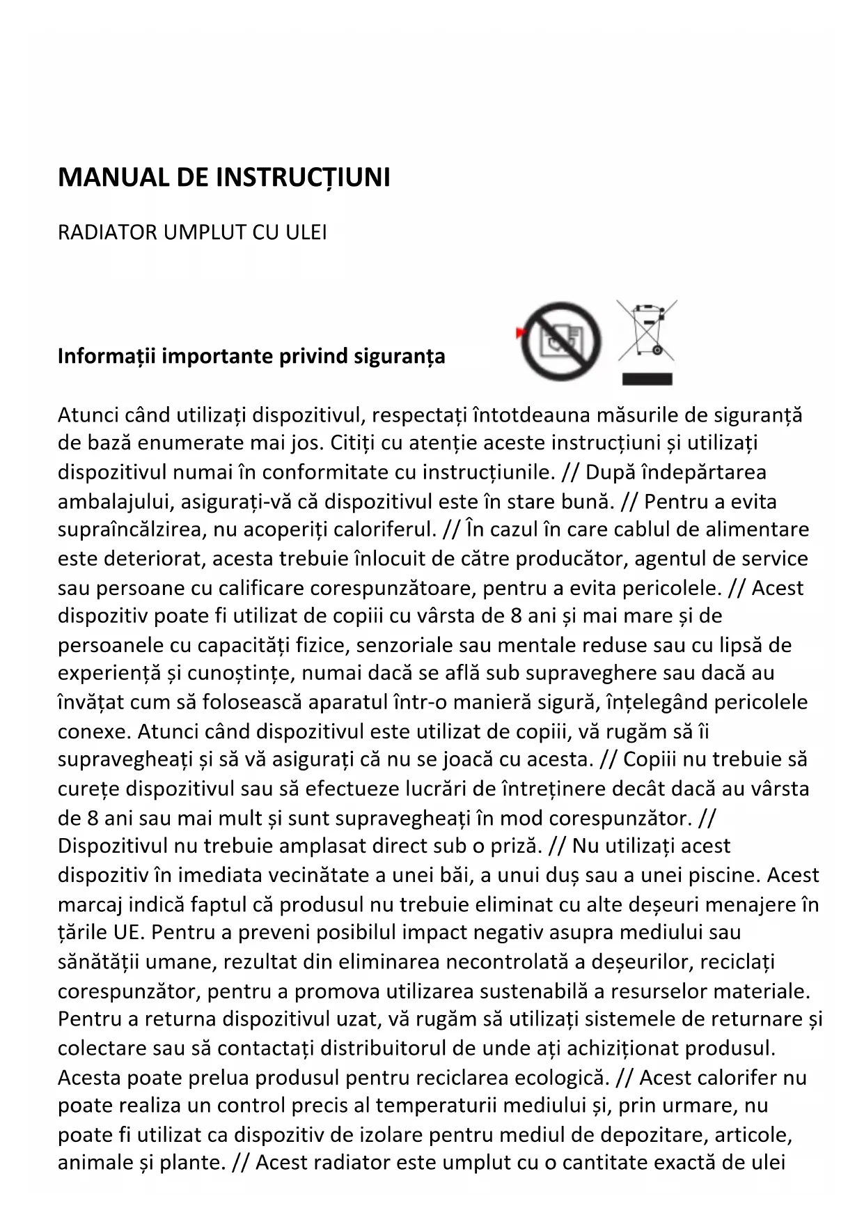 Informații importante privind siguranța Atunci când utilizați dispozitivul, respectați întotdeauna măsurile de siguranță de bază enumerate mai jos. Citiți cu atenție aceste instrucțiuni și utilizați dispozitivul numai în conformitate cu instrucțiunile. // După îndepărtarea ambalajului, asigurați-vă că dispozitivul este în stare bună. // Pentru a evita supraîncălzirea, nu acoperiți caloriferul. // În cazul în care cablul de alimentare este deteriorat, acesta trebuie înlocuit de către producător, agentul de service sau persoane cu calificare corespunzătoare, pentru a evita pericolele. // Acest dispozitiv poate fi utilizat de copiii cu vârsta de 8 ani și mai mare și de persoanele cu capacități fizice, senzoriale sau mentale reduse sau cu lipsă de experiență și cunoștințe, numai dacă se află sub supraveghere sau dacă au învățat cum să folosească aparatul într-o manieră sigură, înțelegând pericolele conexe. Atunci când dispozitivul este utilizat de copiii, vă rugăm să îi supravegheați și să vă asigurați că nu se joacă cu acesta. // Copiii nu trebuie să curețe dispozitivul sau să efectueze lucrări de întreținere decât dacă au vârsta de 8 ani sau mai mult și sunt supravegheați în mod corespunzător. // Dispozitivul nu trebuie amplasat direct sub o priză. // Nu utilizați acest dispozitiv în imediata vecinătate a unei băi, a unui duș sau a unei piscine. Acest marcaj indică faptul că produsul nu trebuie eliminat cu alte deșeuri menajere în țările UE. Pentru a preveni posibilul impact negativ asupra mediului sau sănătății umane, rezultat din eliminarea necontrolată a deșeurilor, reciclați corespunzător, pentru a promova utilizarea sustenabilă a resurselor materiale. Pentru a returna dispozitivul uzat, vă rugăm să utilizați sistemele de returnare și colectare sau să contactați distribuitorul de unde ați achiziționat produsul. Acesta poate prelua produsul pentru reciclarea ecologică. // Acest calorifer nu poate realiza un control precis al temperaturii mediului și, prin urmare, nu poate fi utilizat ca dispozitiv de izolare pentru mediul de depozitare, articole, animale și plante. // Acest radiator este umplut cu o cantitate exactă de uleispecial. Reparațiile care necesită deschiderea recipientului de ulei trebuie efectuate numai de producător sau de agentul său de service, care trebuie contactat în cazul unei scurgeri de ulei. Atunci când scoateți dispozitivul din uz, respectați reglementările privind eliminarea uleiului. // 10. Acest calorifer nu poate realiza un control precis al temperaturii mediului și, prin urmare, nu poate fi utilizat ca dispozitiv de izolare pentru mediul de depozitare, articole, animale și plante. // Acest dispozitiv este destinat exclusiv utilizării casnice. Atenționare Există risc de incendiu dacă radiatorul este acoperit sau dacă este poziționat în apropierea perdelelor sau a altor materiale combustibile. // Unele părți ale acestui produs se pot încinge și pot provoca arsuri. Trebuie să acordați o atenție deosebită acestui dispozitiv, în prezența copiilor și a persoanelor vulnerabile.FIGURA COMPONENTELOR (OR2000M) Elemente Buton de alimentare Buton termostat Tambur de cablu Roți UTILIZAREA RADIATORULUI UMPLUT CU ULEI (OR2000M)