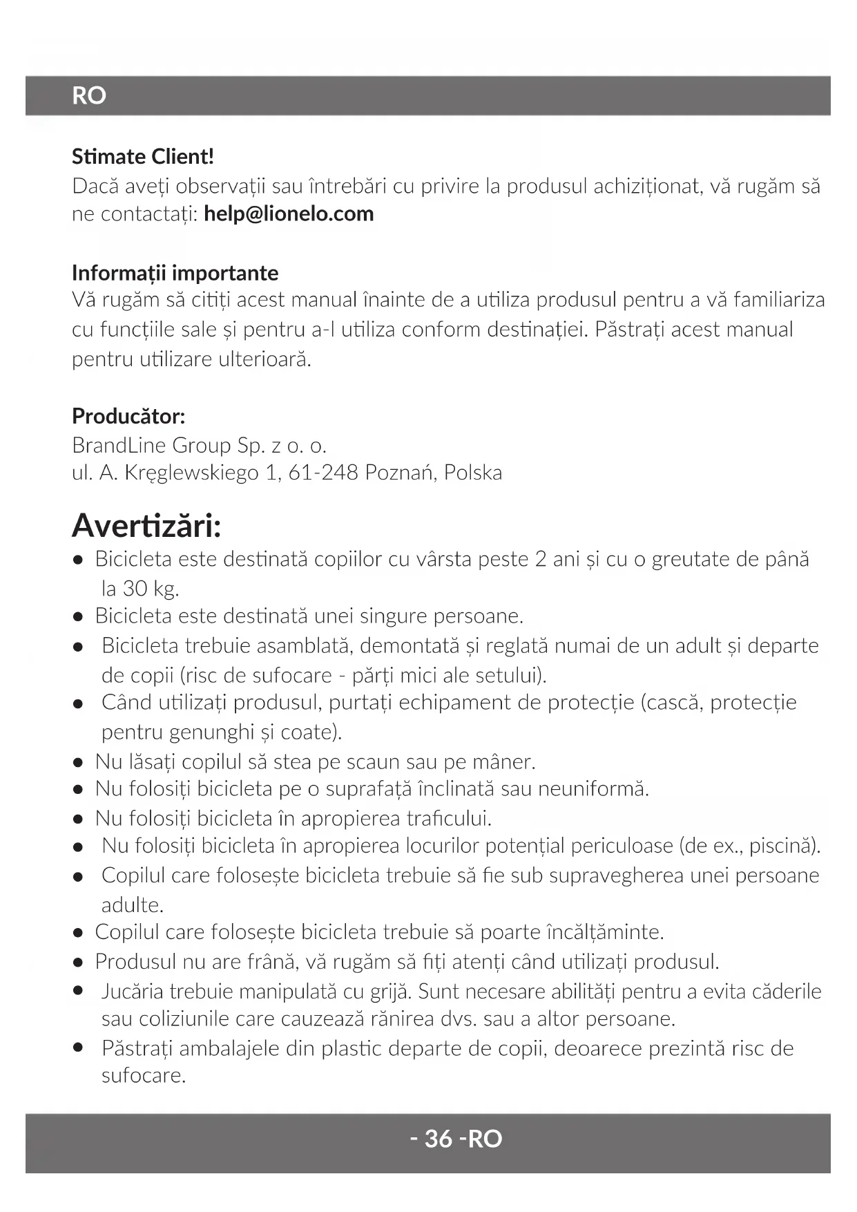 Introduceți șul (A) prin oriciul furcii bicicletei, apoi prin: manșonul (B), roata (C), al doilea manșon (B) și al doilea oriciuu de pe furcă. Strângeți piulița axului (D) cu o cheie de p imbus. Montajul ambelor roți al bicicletei este idenc. Înainte de ulizare asigurați-vă că toate elementele de xare sunt strânse corespunzător. Ulizare Trebuie să vă așezați pe scaun, să apucați ferm ambele mânere ale ghidonului și apoi împingeți alternav picioarele de la sol. După ce accelerați, ridicați picioarele pentru a călători liber. În acest fel, copilul ar trebui să învețe cum să păstreze echilibrul. Întoarcerea are loc prin rorea ghidonului în direcția virajului și echilibrarea corpului. Trebuie să frânați angând pământul cu picioarele. Întreținere și curățare Curățați bicicleta cu o cârpă umedă și apoi uscați-o. Nu ulizați detergenți corozivi sau abrazivi pentru a curăța produsul. Produsul a fost testat și respectă standardele: EN 71-1:2014+A1:2018, EN 71-2:2020, EN 71-3:2019+A1:2021 Fotograile sunt doar ilustrave, aspectul real al produselor poate diferi de cel prezentat în fotograi.‑ 39 ‑ Szczegółowe warunki gwarancji dostępne są na stronie: Detailed warranty condions are available on the website: Detaillierte Garanebedingungen nden Sie auf der Website: Подробные условия гарантии доступны на сайте: Le condizioni di garanzia deagliate sono disponibili sul sito web: Les condions de garane détaillées sont disponibles sur le site: Las condiciones de garana detalladas están disponibles en el sio web: Gedetailleerde garanevoorwaarden zijn beschikbaar op de website: Išsamias garanjos sąlygas rasite svetainėje: Podrobné záruční podmínky jsou k dispozici na webových stránkách: A részletes garanciális feltételek elérhetők a weboldalon: Condiții detaliate de garanție sunt disponibile pe site: www.lionelo.com Thank you for purchasing our product Dziękujemy za zakup urządzenia naszej marki Vielen Dank für den Kauf unserer Markenausrüstung Спасибо за покупку нашего продукта Grazie per aver acquistato il nostro prodoo Merci d’avoir acheté notre produit Gracias por adquirir nuestro producto Bedankt voor het aanschaen van ons product Dėkojame, kad įsigijote mūsų prekės ženklo įrenginį Děkujeme vám za zakoupení zařízení naší značky Köszönjük, hogy márkájú készülékünket választoa Vă mulțumim că ați achiziționat un dispoziv al mărcii noastrewww.lionelo.com