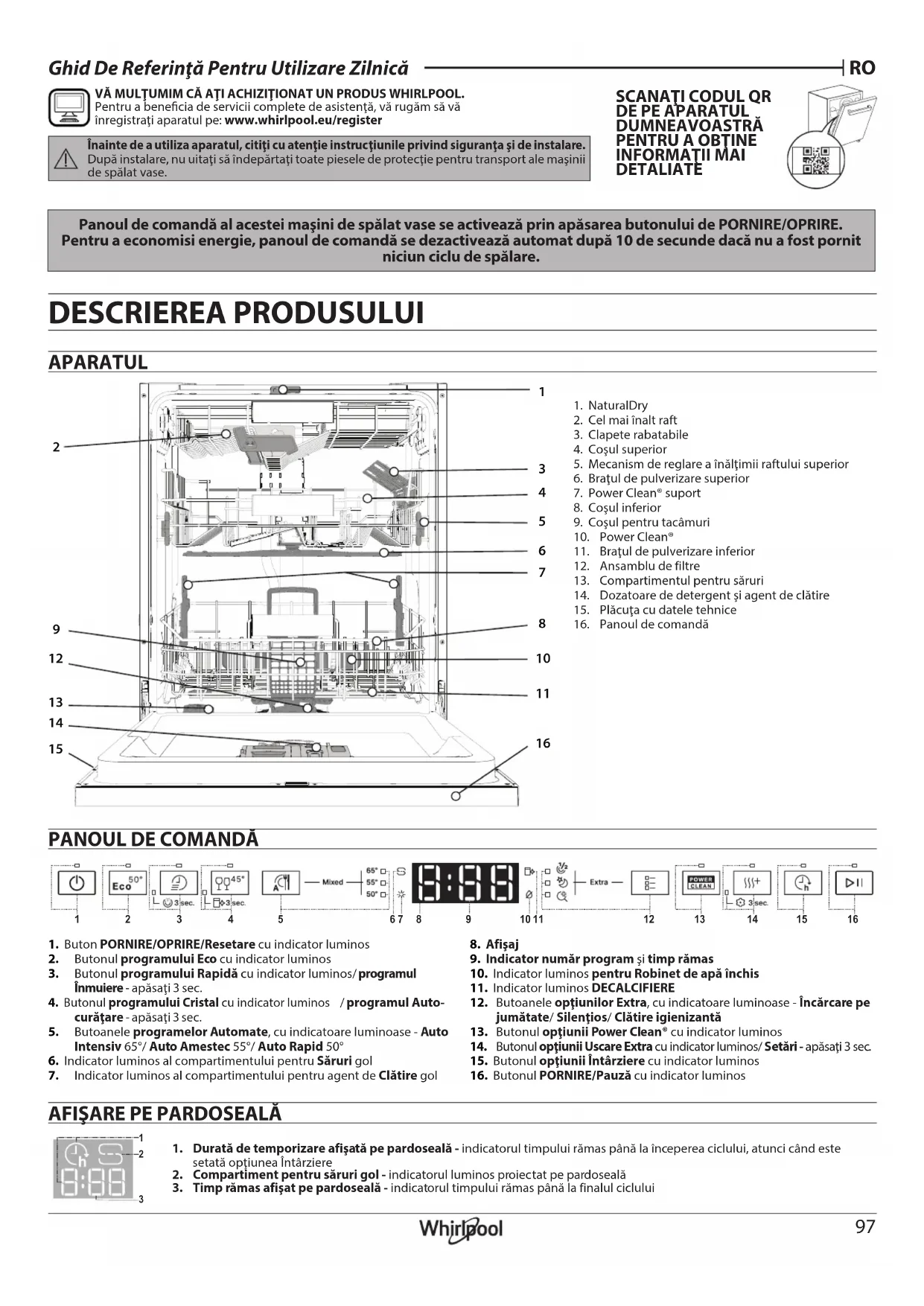 1. NaturalDry2. Cel mai înalt raft3. Clapete rabatabile4. Coşul superior5. Mecanism de reglare aînălţimii raftului superior6. Braţul de pulverizare superior7. Power Clean® suport8. Coşul inferior9. Coşul pentru tacâmuri10. Power Clean®11. Braţul de pulverizare inferior12. Ansamblu de filtre13. Compartimentul pentru săruri14. Dozatoare de detergent şi agent de clătire15. Plăcuţa cu datele tehnice16. Panoul de comandă