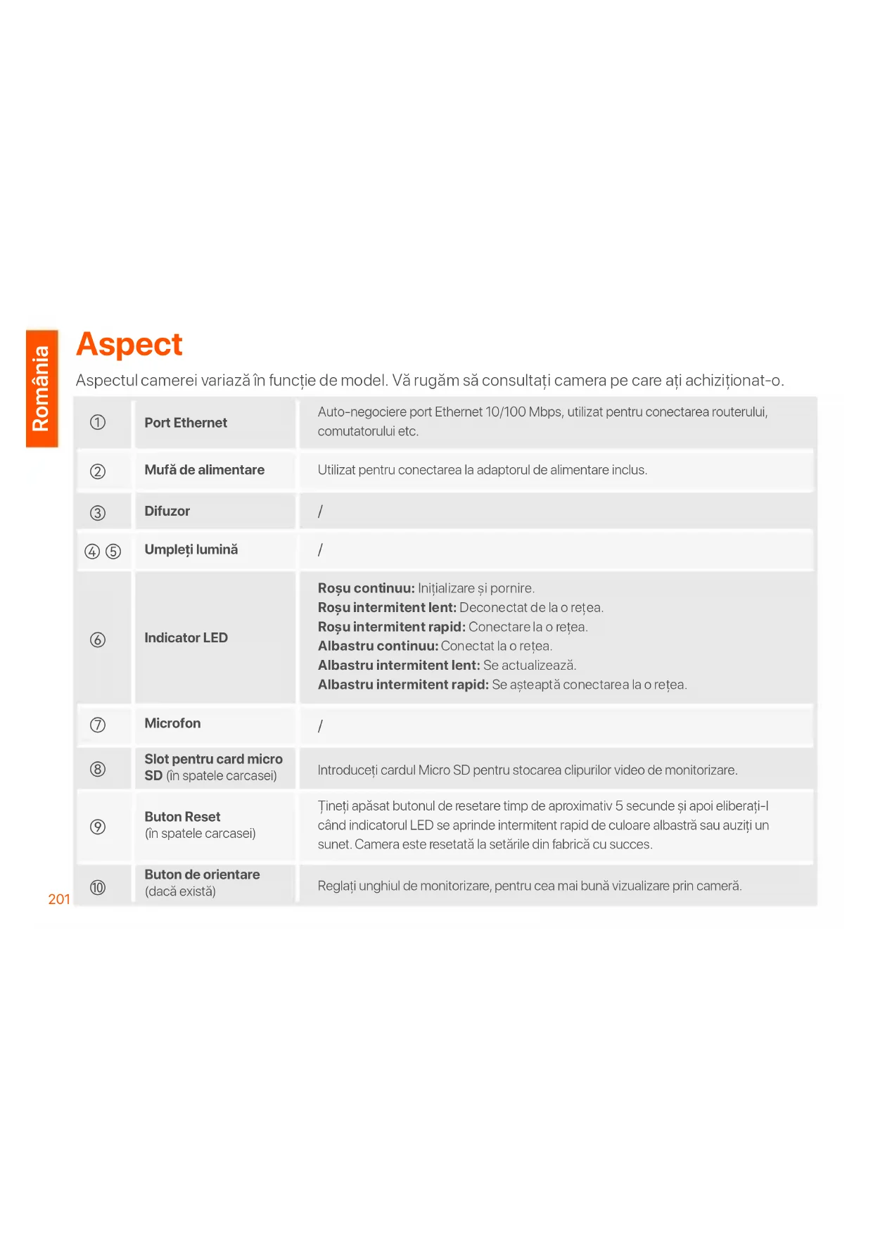 Utilizat pentru conectarea la adaptorul de alimentare inclus. Auto-negociere port Ethernet 10/100 Mbps, utilizat pentru conectarea routerului, comutatorului etc. Roșu continuu: Iniţializare și pornire. Roșu intermitent lent: Deconectat de la o reţea. Roșu intermitent rapid: Conectare la o reţea. Albastru continuu: Conectat la o reţea. Albastru intermitent lent: Se actualizează. Albastru intermitent rapid: Se așteaptă conectarea la o reţea. Introduceţi cardul Micro SD pentru stocarea clipurilor video de monitorizare. Ţineţi apăsat butonul de resetare timp de aproximativ 5 secunde și apoi eliberaţi-l când indicatorul LED se aprinde intermitent rapid de culoare albastră sau auziţi un sunet. Camera este resetată la setările din fabrică cu succes. Reglaţi unghiul de monitorizare, pentru cea mai bună vizualizare prin cameră. Umpleţi lumină Indicator LED Microfon Difuzor