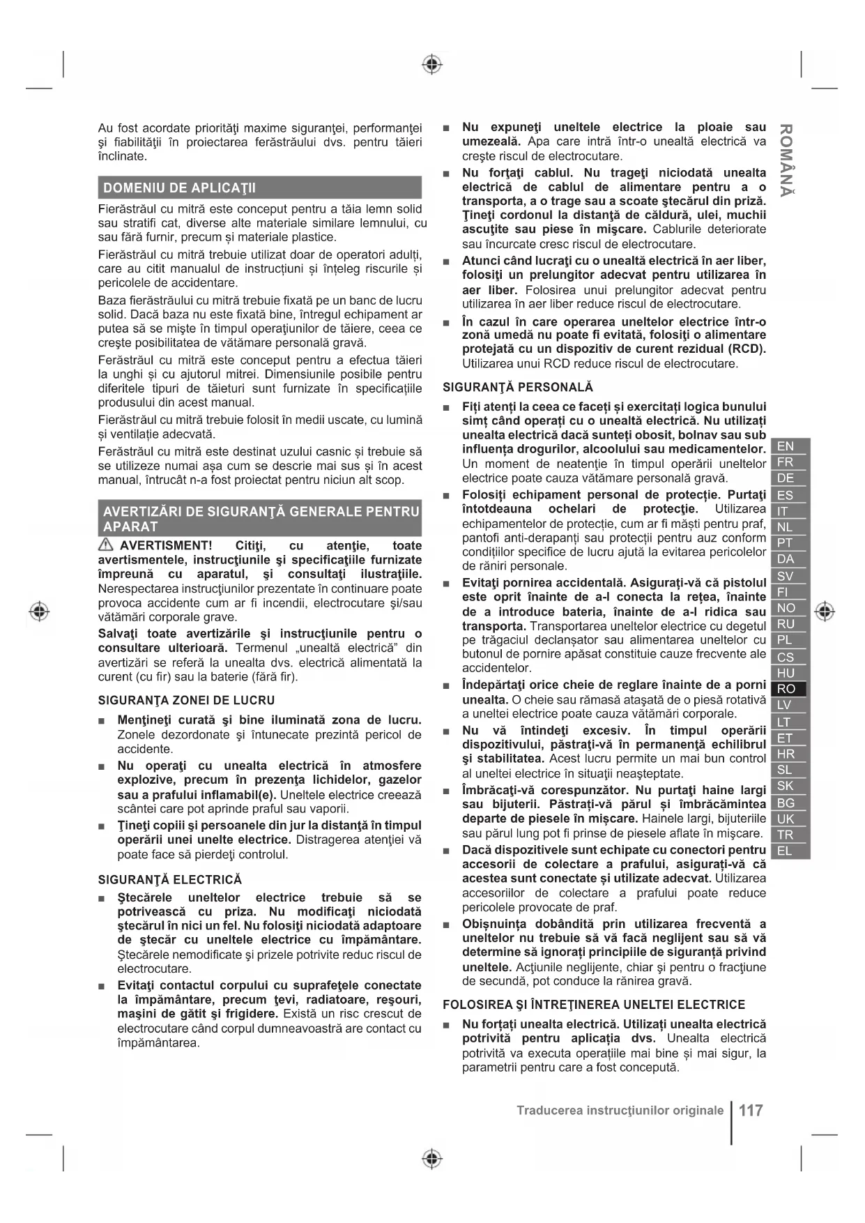 Traducerea instrucţiunilor originaleasigurați-vă că nu este posibilă o interferență a acoperitoarei lamei înainte de a începe operațiunea de tăiere, pentru a reduce riscul de rănire gravă. ■ Temperatura ambientală în timpul funcționării uneltei trebuie să fie cuprinsă între 0°C și 40°C. ■ Temperatura ambientală în timpul depozitării uneltei trebuie să fie cuprinsă între 0°C și 40°C. ■ Temperatura ambientală în timpul încărcării uneltei (produsului) trebuie să fie cuprinsă între 10°C și 38°C.