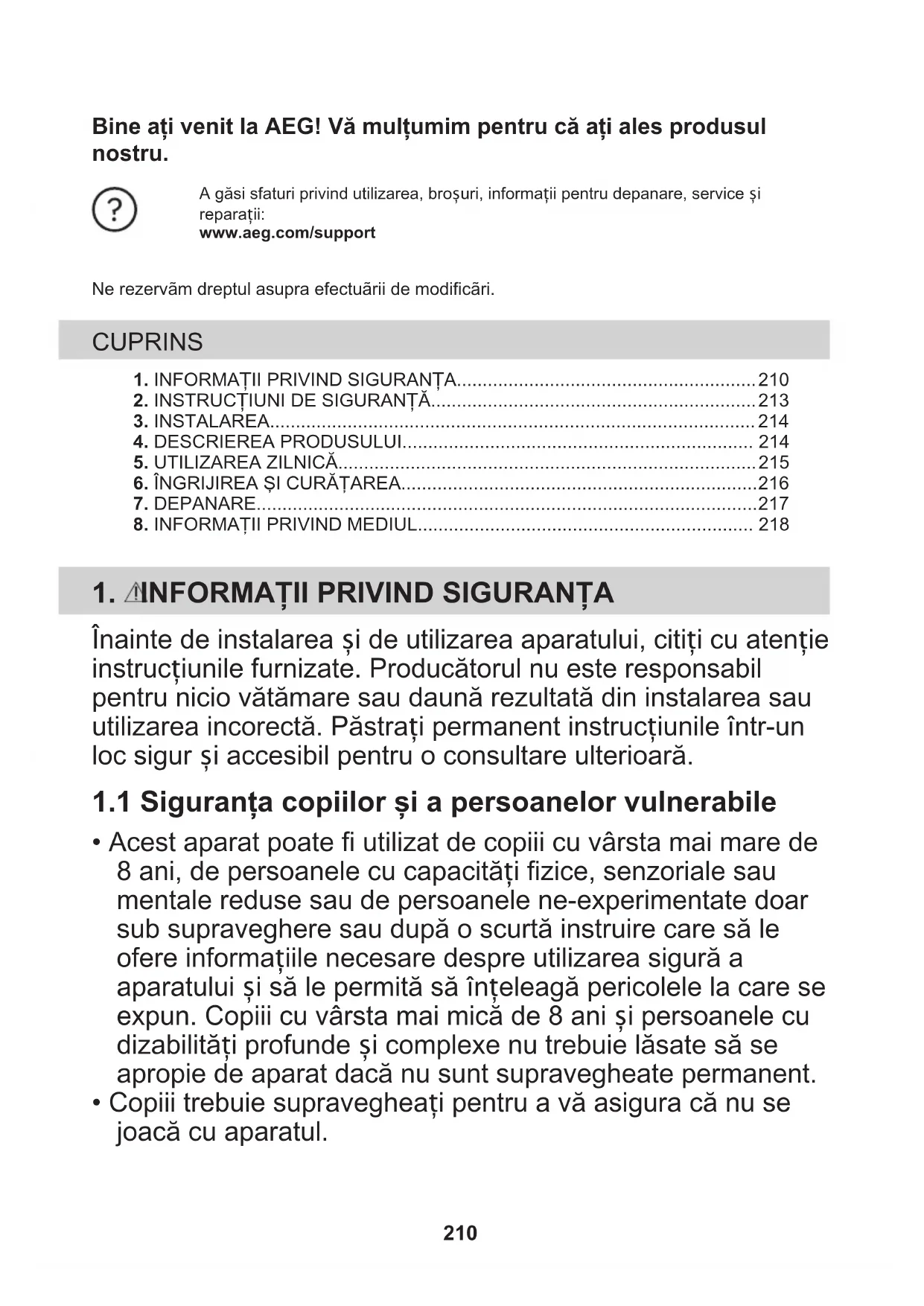- Copiii trebuie supravegheați pentru a vă asigura că nu se joacă cu aparatul. 210• Nu lăsați ambalajele la îndemâna copiilor și aruncați-le conform reglementărilor.