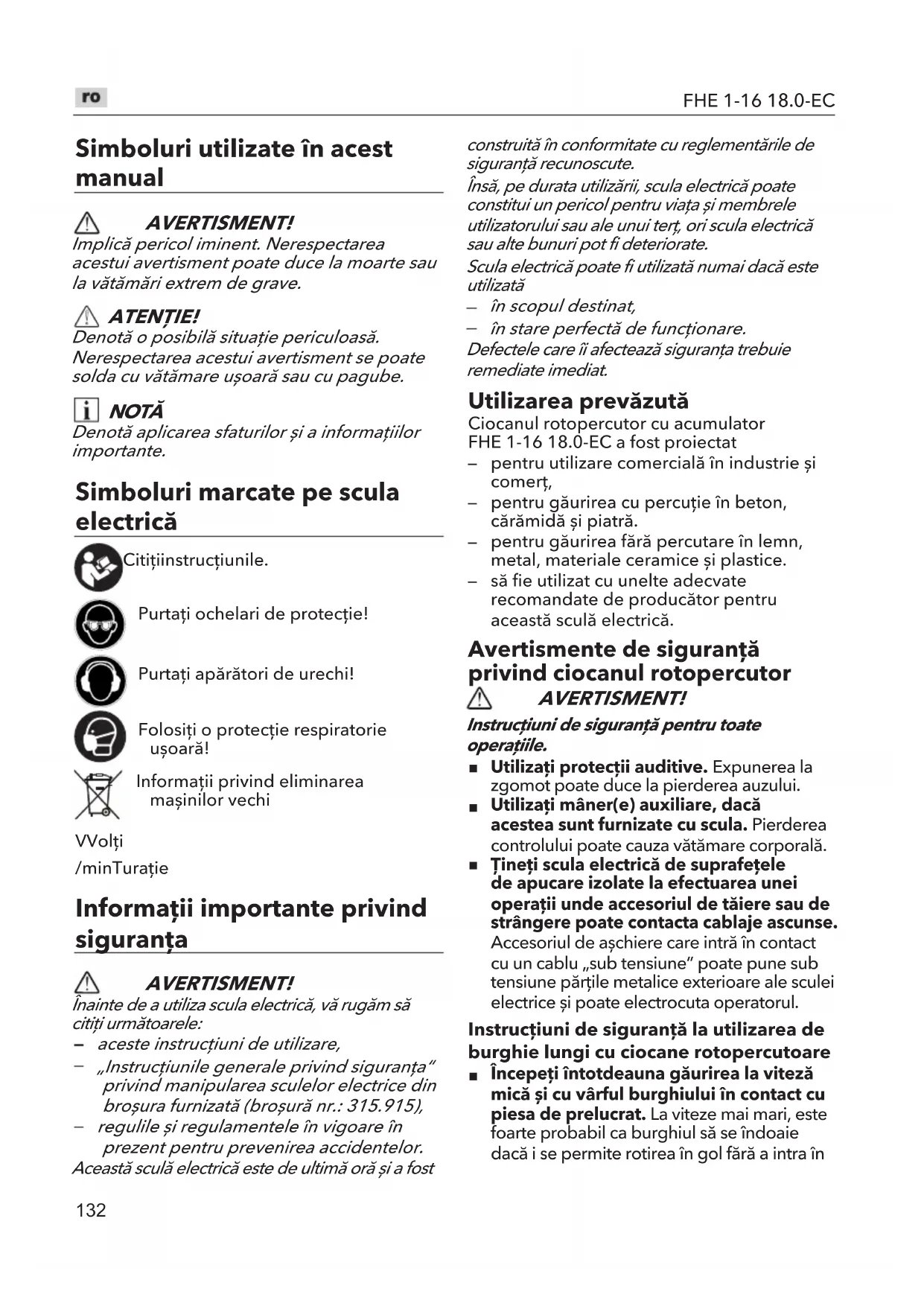 Simboluri utilizate în acest manual AVERTISMENT! Implică pericol iminent. Nerespectarea acestui avertisment poate duce la moarte sau la vătămări extrem de grave. ATENȚIE! Denotă o posibilă situație periculoasă. Nerespectarea acestui avertisment se poate solda cu vătămare ușoară sau cu pagube. NOTĂ Denotă aplicarea sfaturilor și a informațiilor importante. Simboluri marcate pe scula electrică Citiți instrucțiunile. Purtați ochelari de protecție! Purtați apărători de urechi! Folosiți o protecție respiratorie ușoară! Informații privind eliminarea mașinilor vechi V Volți /min Turație Informații importante privind siguranța AVERTISMENT! Înainte de a utiliza scula electrică, vă rugăm să citiți următoarele: aceste instrucțiuni de utilizare, „Instrucțiunile generale privind siguranța“ privind manipularea sculelor electrice din broșura furnizată (broșură nr.: 315.915), regulile și regulamentele în vigoare în prezent pentru prevenirea accidentelor. Această sculă electrică este de ultimă oră și a fost construită în conformitate cu reglementările de siguranță recunoscute. Însă, pe durata utilizării, scula electrică poate constitui un pericol pentru viața și membrele utilizatorului sau ale unui terț, ori scula electrică sau alte bunuri pot fi deteriorate. Scula electrică poate fi utilizată numai dacă este utilizată în scopul destinat, în stare perfectă de funcționare. Defectele care îi afectează siguranța trebuie remediate imediat. Utilizarea prevăzută Ciocanul rotopercutor cu acumulator FHE 1-16 18.0-EC a fost proiectat