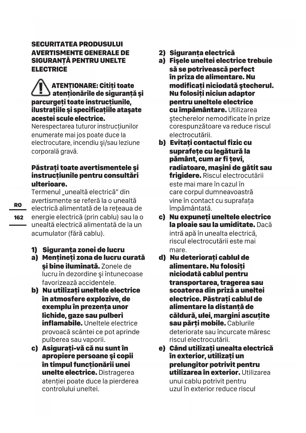 a) Fişele uneltei electrice trebuie să se potrivească perfect în priza de alimentare. Nu modificaţi niciodată ştecherul. Nu folosiţi niciun adaptor pentru uneltele electrice cu împământare. Utilizarea ştecherelor nemodificate în prize corespunzătoare va reduce riscul electrocutării. b) Evitaţi contactul fizic cu suprafeţe cu legătură la pământ, cum ar fi ţevi, radiatoare, maşini de gătit sau frigidere. Riscul electrocutării este mai mare în cazul în care corpul dumneavoastră vine în contact cu suprafaţa împământată. c) Nu expuneţi uneltele electrice la ploaie sau la umiditate. Dacă intră apă în unealta electrică, riscul electrocutării este mai mare. d) Nu deterioraţi cablul de alimentare. Nu folosiţi niciodată cablul pentru transportarea, tragerea sau scoaterea din priză a uneltei electrice. Păstraţi cablul de alimentare la distanţă de căldură, ulei, margini ascuţite sau părţi mobile. Cablurile deteriorate sau încurcate măresc riscul electrocutării. e) Când utilizaţi unealta electrică în exterior, utilizaţi un prelungitor potrivit pentru utilizarea în exterior. Utilizarea unui cablu potrivit pentru uzul în exterior reduce riscul163