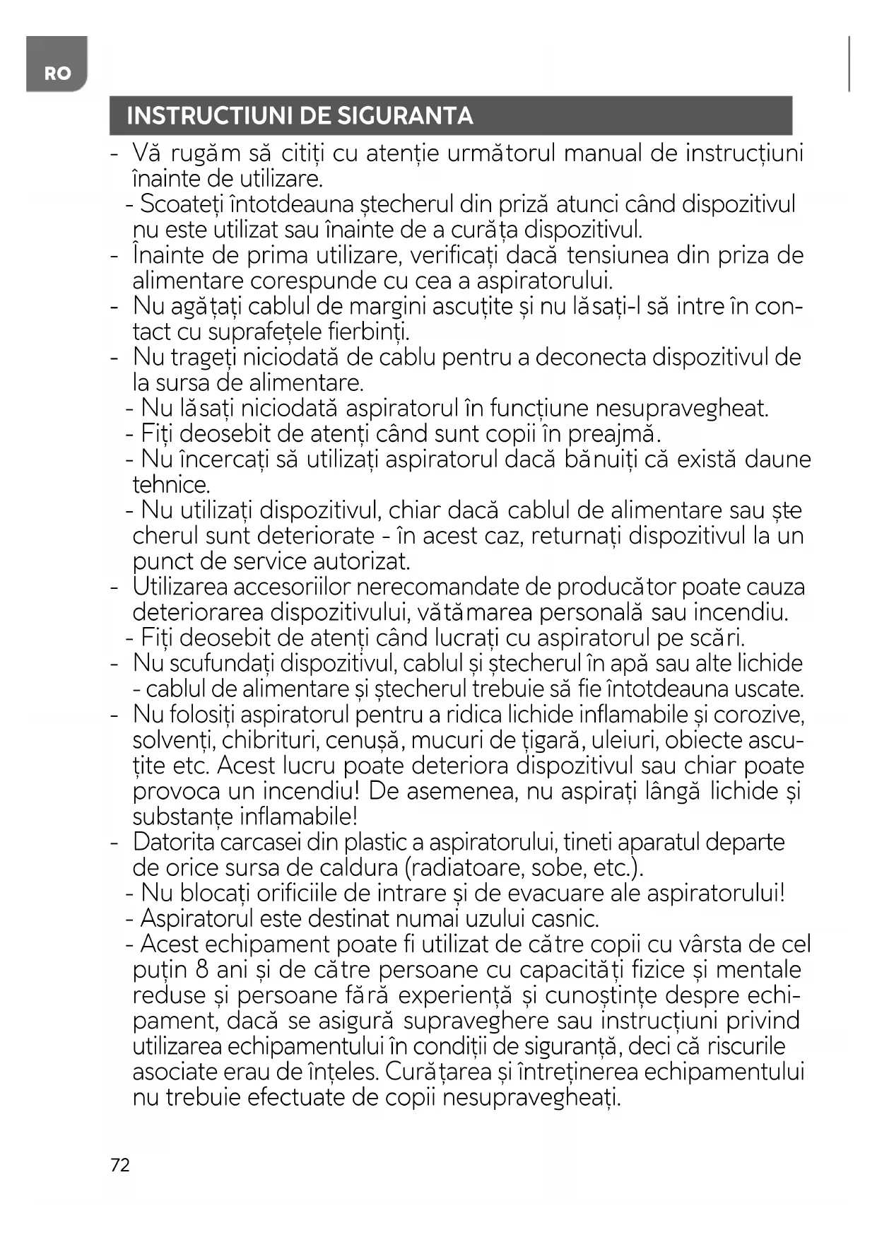 Datorita carcasei din plastic a aspiratorului, tineti aparatul departe de orice sursa de caldura (radiatoare, sobe, etc.). - Nu blocați orificiile de intrare și de evacuare ale aspiratorului! - Aspiratorul este destinat numai uzului casnic. - Acest echipament poate fi utilizat de către copii cu vârsta de cel puțin 8 ani și de către persoane cu capacități fizice și mentale reduse și persoane fără experiență și cunoștințe despre echi- pament, dacă se asigură supraveghere sau instrucțiuni privind utilizarea echipamentului în condiții de siguranță, deci că riscurile asociate erau de înțeles. Curățarea și întreținerea echipamentului nu trebuie efectuate de copii nesupravegheați.73