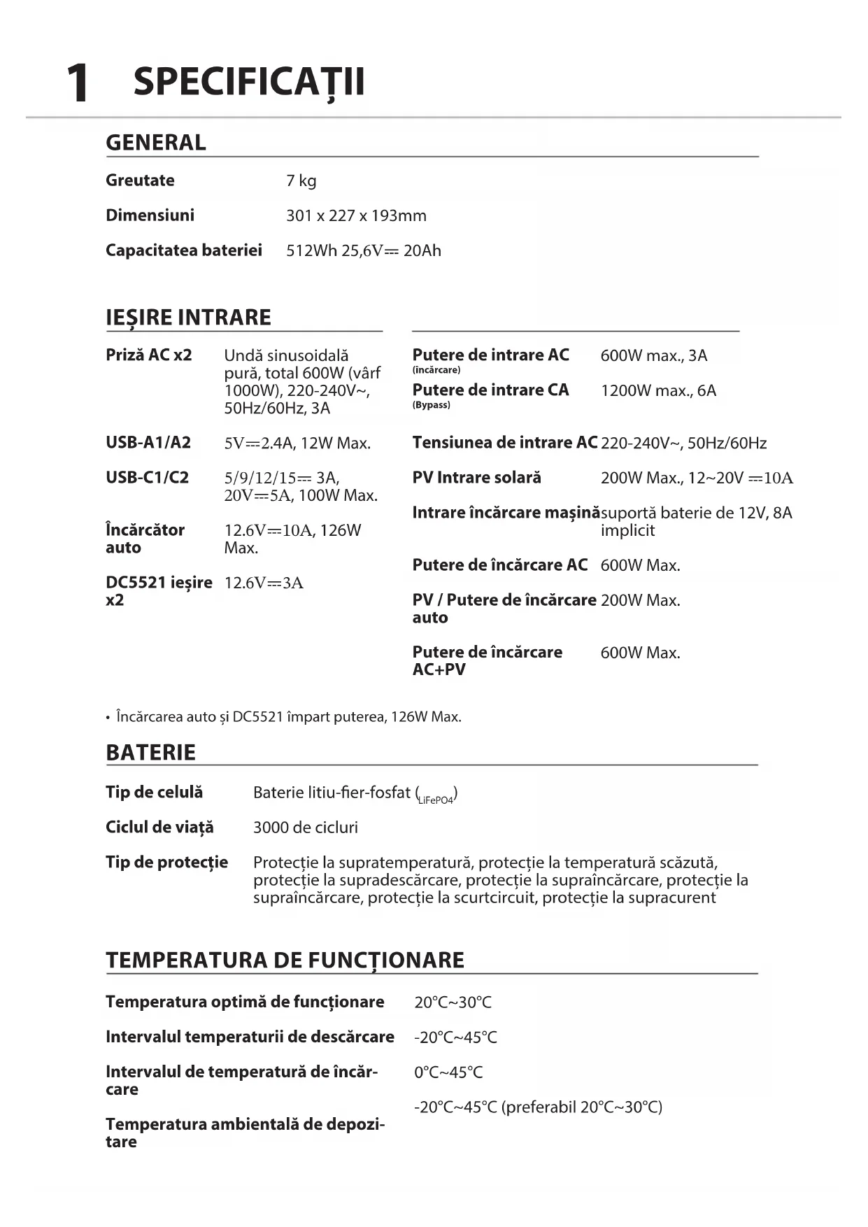 3000 de cicluri Protecție la supratemperatură, protecție la temperatură scăzută, protecție la supradescărcare, protecție la supraîncărcare, protecție la supraîncărcare, protecție la scurtcircuit, protecție la supracurent 20°C~30°C -20°C~45°C 0°C~45°C -20°C~45°C (preferabil 20°C~30°C) 600W max., 3A 1200W max., 6A 220-240V~, 50Hz/60Hz 200W Max., 12~20V ⎓10A suportă baterie de 12V, 8A implicit 600W Max. 200W Max. 600W Max.