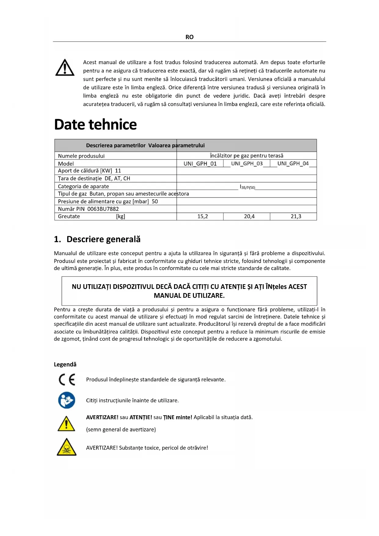 Manualul de utilizare este conceput pentru a ajuta la utilizarea în siguranță și fără probleme a dispozitivului. Produsul este proiectat și fabricat în conformitate cu ghiduri tehnice stricte, folosind tehnologii și componente de ultimă generație. În plus, este produs în conformitate cu cele mai stricte standarde de calitate. NU UTILIZAȚI DISPOZITIVUL DECĂ DACĂ CITIȚI CU ATENȚIE ȘI AȚI ÎNțeles ACEST MANUAL DE UTILIZARE. Pentru a crește durata de viață a produsului și pentru a asigura o funcționare fără probleme, utilizați-l în conformitate cu acest manual de utilizare și efectuați în mod regulat sarcini de întreținere. Datele tehnice și specificațiile din acest manual de utilizare sunt actualizate. Producătorul își rezervă dreptul de a face modificări asociate cu îmbunătățirea calității. Dispozitivul este conceput pentru a reduce la minimum riscurile de emisie de zgomot, ținând cont de progresul tehnologic și de oportunitățile de reducere a zgomotului. Legendă Produsul îndeplinește standardele de siguranță relevante. Citiți instrucțiunile înainte de utilizare. AVERTIZARE! sau ATENȚIE! sau ȚINE minte! Aplicabil la situația dată. (semn general de avertizare) AVERTIZARE! Substanțe toxice, pericol de otrăvire!RO Nu atingeți! ATENȚIE! Suprafata fierbinte, risc de arsuri! VĂ RUGĂM SĂ REȚINEȚI! Desenele din acest manual au doar scop ilustrativ și, în unele detalii, pot diferi de produsul real.
