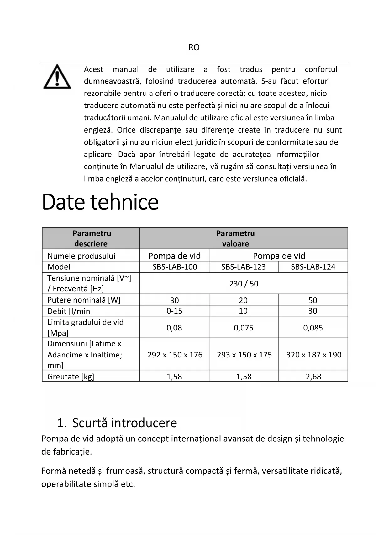 Acest manual de utilizare a fost tradus pentru confortul dumneavoastră, folosind traducerea automată. S-au făcut eforturi rezonabile pentru a oferi o traducere corectă; cu toate acestea, nicio traducere automată nu este perfectă și nici nu are scopul de a înlocui traducătorii umani. Manualul de utilizare oficial este versiunea în limba engleză. Orice discrepanțe sau diferențe create în traducere nu sunt obligatorii și nu au niciun efect juridic în scopuri de conformitate sau de aplicare. Dacă apar întrebări legate de acuratețea informațiilor conținute în Manualul de utilizare, vă rugăm să consultați versiunea în limba engleză a acelor conținuturi, care este versiunea oficială. Date tehnice Parametru descriere Parametru valoare Numele produsului Pompa de vid Pompa de vid Model SBS-LAB-100 SBS-LAB-123 SBS-LAB-124 Tensiune nominală [V~] / Frecvență [Hz] 230 / 50 Putere nominală [W]