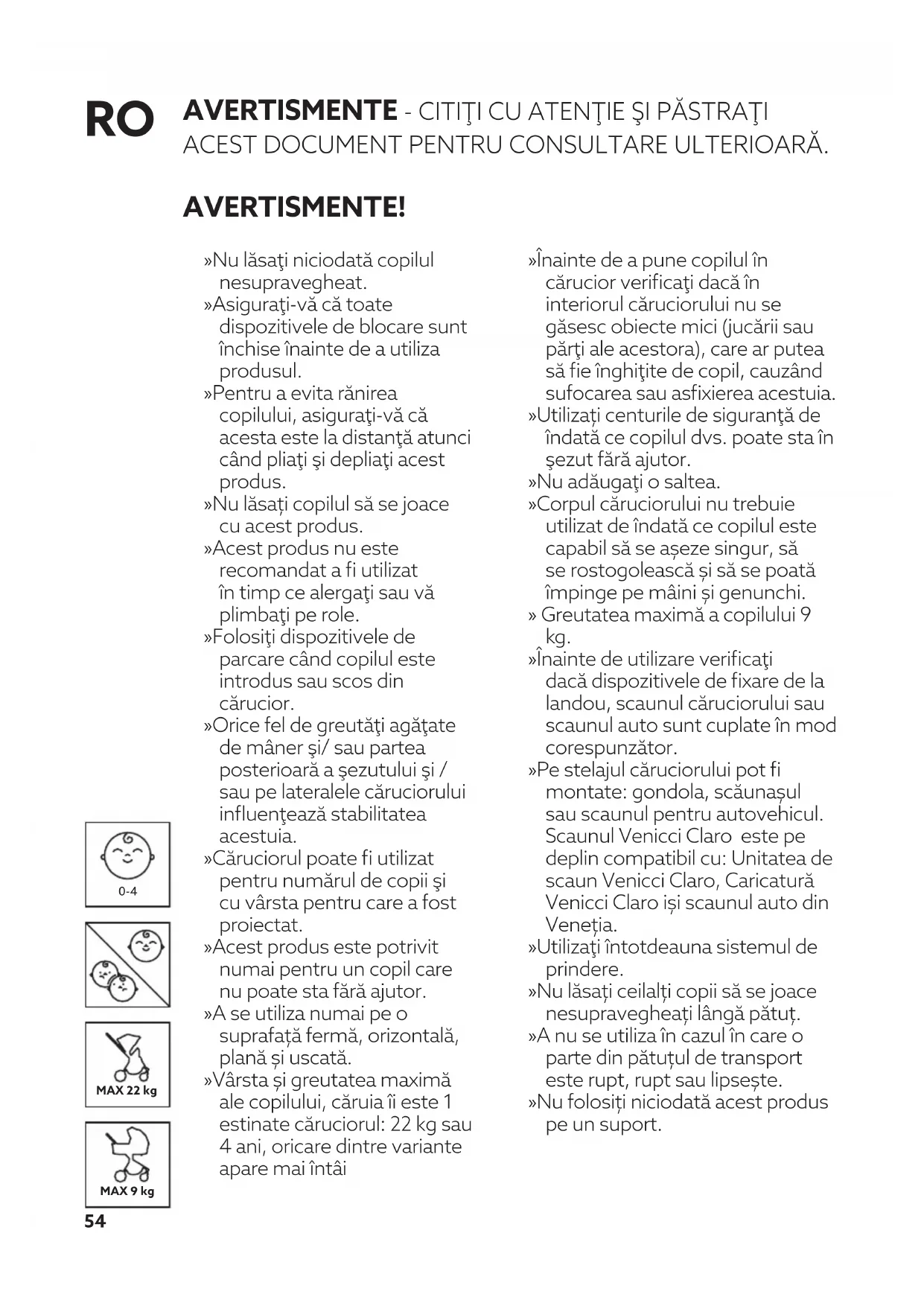 AVERTISMENTE - CITIŢI CU ATENŢIE ŞI PĂSTRAŢI ACEST DOCUMENT PENTRU CONSULTARE ULTERIOARĂ. AVERTISMENTE! » Nu lăsaţi niciodată copilul nesupravegheat. » Asiguraţi-vă că toate dispozitivele de blocare sunt închise înainte de a utiliza produsul. » Pentru a evita rănirea copilului, asiguraţi-vă că acesta este la distanţă atunci când pliaţi şi depliaţi acest produs. » Nu lăsați copilul să se joace cu acest produs. » Acest produs nu este recomandat a fi utilizat în timp ce alergaţi sau vă plimbaţi pe role. » Folosiţi dispozitivele de parcare când copilul este introdus sau scos din cărucior. » Orice fel de greutăţi agăţate de mâner şi/ sau partea posterioară a şezutului şi / sau pe lateralele căruciorului influenţează stabilitatea acestuia. » Căruciorul poate fi utilizat pentru numărul de copii şi cu vârsta pentru care a fost proiectat. » Acest produs este potrivit numai pentru un copil care nu poate sta fără ajutor. » A se utiliza numai pe o suprafață fermă, orizontală, plană și uscată. » Vârsta și greutatea maximă ale copilului, căruia îi este 1 estinate căruciorul: 22 kg sau 4 ani, oricare dintre variante apare mai întâi » Înainte de a pune copilul în cărucior verificaţi dacă în interiorul căruciorului nu se găsesc obiecte mici (jucării sau părţi ale acestora), care ar putea să fie înghiţite de copil, cauzând sufocarea sau asfixierea acestuia. » Utilizați centurile de siguranţă de îndată ce copilul dvs. poate sta în şezut fără ajutor. » Nu adăugaţi o saltea. » Corpul căruciorului nu trebuie utilizat de îndată ce copilul este capabil să se așeze singur, să se rostogolească și să se poată împinge pe mâini și genunchi. » Greutatea maximă a copilului 9 kg. » Înainte de utilizare verificaţi dacă dispozitivele de fixare de la landou, scaunul căruciorului sau scaunul auto sunt cuplate în mod corespunzător. » Pe stelajul căruciorului pot fi montate: gondola, scăunașul sau scaunul pentru autovehicul. Scaunul Venicci Claro este pe deplin compatibil cu: Unitatea de scaun Venicci Claro, Caricatură Venicci Claro iși scaunul auto din Veneția. » Utilizaţi întotdeauna sistemul de prindere. » Nu lăsați ceilalți copii să se joace nesupravegheați lângă pătuț. » A nu se utiliza în cazul în care o parte din pătuțul de transport este rupt, rupt sau lipsește. » Nu folosiți niciodată acest produs pe un suport.55 AVERTISMENTE!