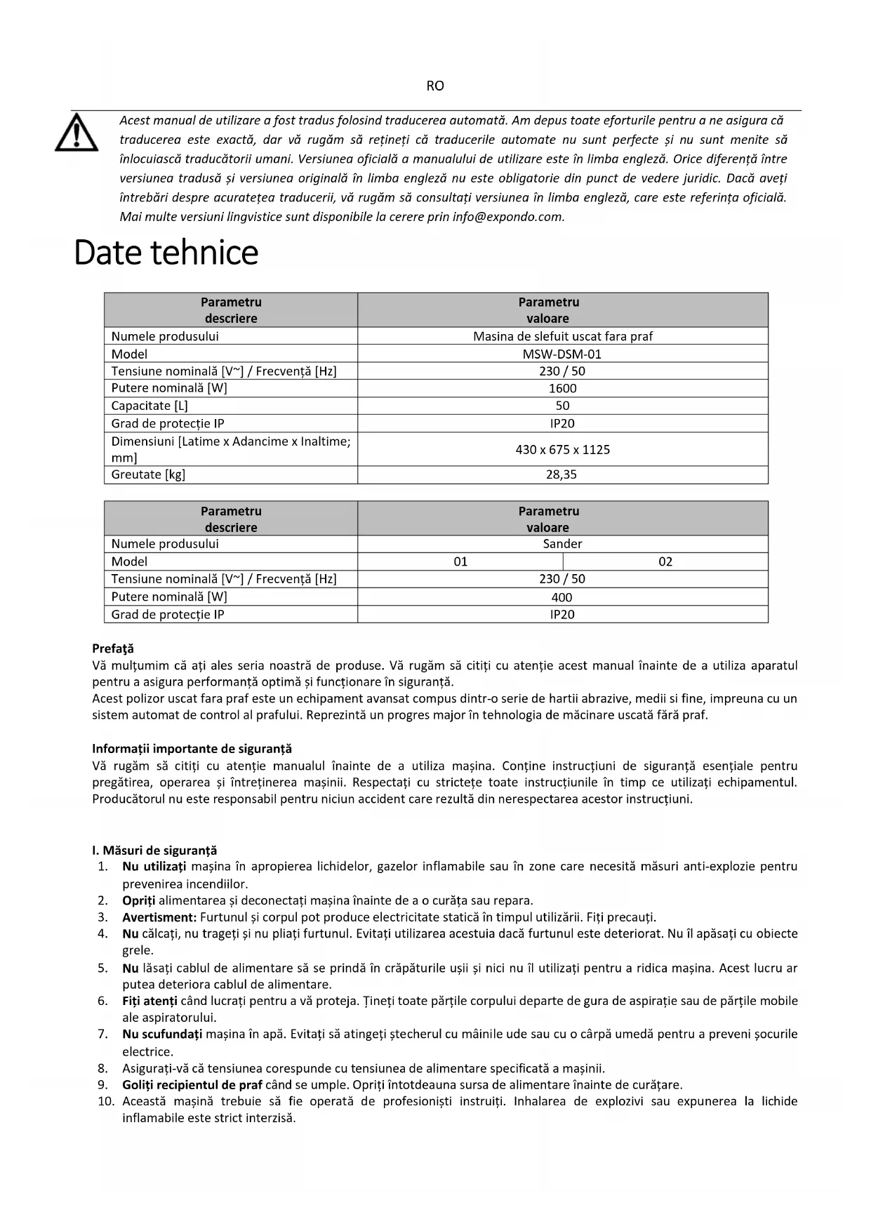 Acest manual de utilizare a fost tradus folosind traducerea automată. Am depus toate eforturile pentru a ne asigura că traducerea este exactă, dar vă rugăm să rețineți că traducerile automate nu sunt perfecte și nu sunt menite să înlocuiască traducătorii umani. Versiunea oficială a manualului de utilizare este în limba engleză. Orice diferență între versiunea tradusă și versiunea originală în limba engleză nu este obligatorie din punct de vedere juridic. Dacă aveți întrebări despre acuratețea traducerii, vă rugăm să consultați versiunea în limba engleză, care este referința oficială. Mai multe versiuni lingvistice sunt disponibile la cerere prin info@expondo.com. Date tehnice Parametru descriere Parametru valoare Numele produsului Masina de slefuit uscat fara praf Model MSW-DSM-01 Tensiune nominală [V~] / Frecvență [Hz] 230 / 50 Putere nominală [W]