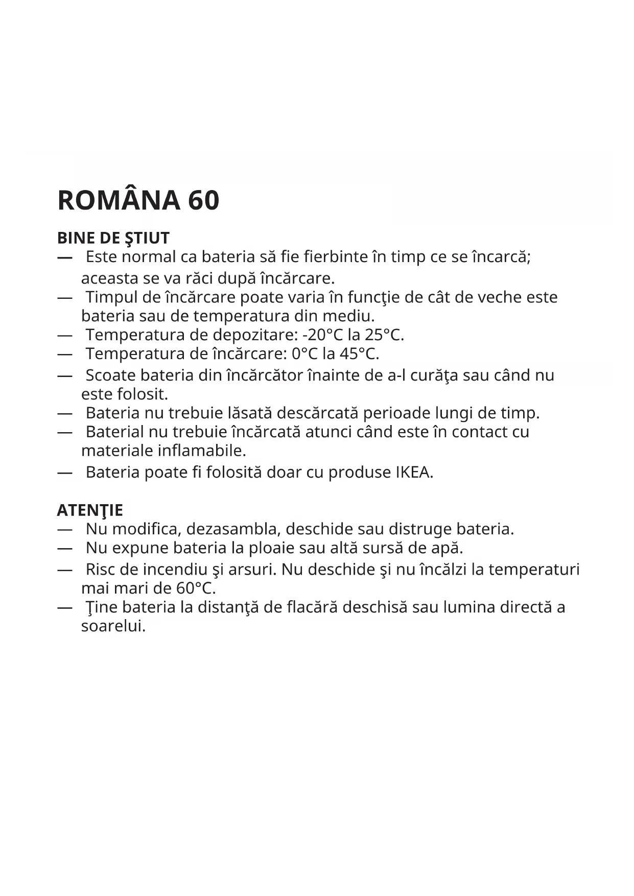 — Este normal ca bateria să e erbinte în timp ce se încarcă; aceasta se va răci după încărcare. — Timpul de încărcare poate varia în funcţie de cât de veche este bateria sau de temperatura din mediu. — Temperatura de depozitare: -20°C la 25°C. — Temperatura de încărcare: 0°C la 45°C. — Scoate bateria din încărcător înainte de a-l curăţa sau când nu este folosit. — Bateria nu trebuie lăsată descărcată perioade lungi de timp. — Baterial nu trebuie încărcată atunci când este în contact cu materiale inamabile. — Bateria poate folosită doar cu produse IKEA. ATENŢIE — Nu modica, dezasambla, deschide sau distruge bateria. — Nu expune bateria la ploaie sau altă sursă de apă. — Risc de incendiu şi arsuri. Nu deschide şi nu încălzi la temperaturi mai mari de 60°C. — Ţine bateria la distanţă de acără deschisă sau lumina directă a soarelui.61 — Păstrează bateria la distanţă de aparate cu voltaj înalt — Acest produs nu este o jucărie, nu lăsa la îndemâna copiilor. Asigur-te că toate persoanele care folosesc acest produs au citi şi urmează instrucţiunile. — Nu scurt-circuita bateria. — În cazul în care există scurgeri, evită ca lichidul să intre în contact cu pielea sau cu ochii.