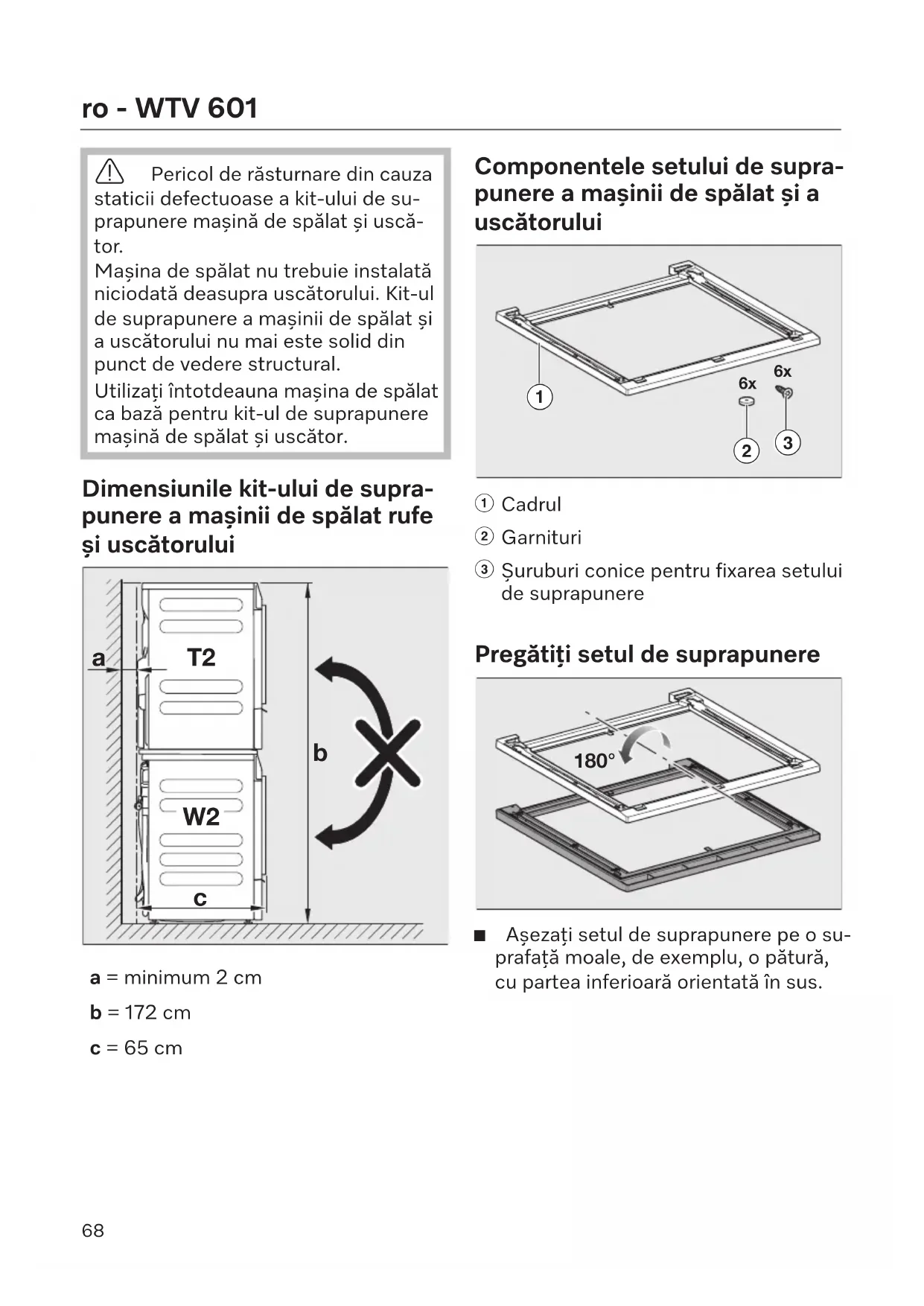 novo a um técnico especializado. 67ro - WTV601 Pericol de răsturnare din cauza staticii defectuoase a kit-ului de su- prapunere mașină de spălat și uscă- tor. Mașina de spălat nu trebuie instalată niciodată deasupra uscătorului. Kit-ul de suprapunere a mașinii de spălat și a uscătorului nu mai este solid din punct de vedere structural. Utilizați întotdeauna mașina de spălat ca bază pentru kit-ul de suprapunere mașină de spălat și uscător. Dimensiunile kit-ului de supra- punere a mașinii de spălat rufe și uscătorului