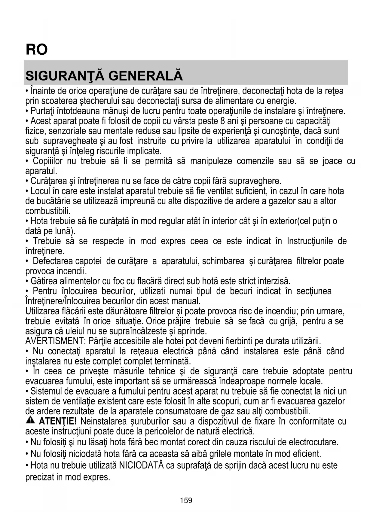 - Nu folosiţi niciodată hota fără ca aceasta să aibă grilele montate în mod eficient.