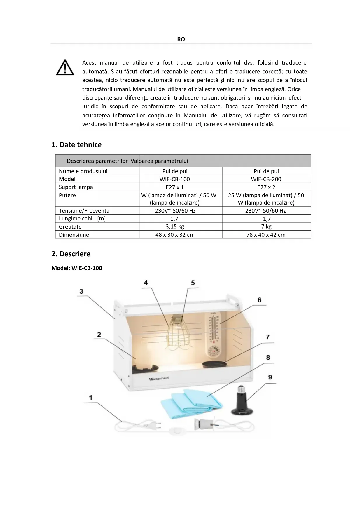 Model: WIE-CB-100RO 1 – Cablu de alimentare 2 – Adăpător de păsări tip bilă 3 – Locuință 4 – Capac antioparire 5 – Lampă cu dimmer 6 – Termometru 7 – Bol de hrănire 8 – Covorașe 9 – Lampă de încălzire cu dimmer Model: WIE-CB-200 1 – Covorașe 2 – Adăpător de păsări tip bilă 3 – Locuință 4 – Capac antioparire 5 – Lampă de încălzire cu dimmer 6 – Termometru 7 – Lampă cu dimmer 8 – Bol de hrănireRO