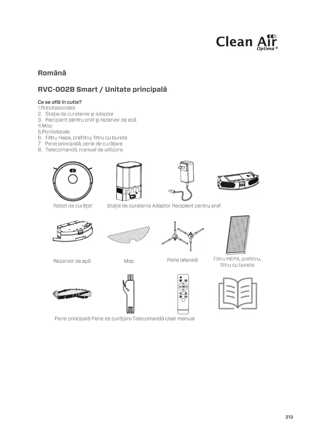 Robot de curăţat Rezervor de apă Perie principală Perie de curăţare Telecomandă User manual Staţie de curatenie Adaptor Recipient pentru praf Mop Perie laterală Filtru HEPA, prefiltru, filtru cu burete214 Română Vă mulţumim că aţi achiziţionat Clean Air Optima® 2in1: Robot aspirator cu staţie de autogolire, funcţie de mop și sterilizare UVC RVC-002B Smart. Vă dorim să vă bucuraţi mulţi ani de acest produs eficient și eficace. Pentru funcţionarea corectă a dispozitivului, asiguraţi-vă că sunt respectate toate măsurile de precauţie pe durata utilizării acestui dispozitiv electric. Aceste instrucţiuni descriu măsurile de precauţie privind siguranţa, care trebuie respectate pe durata funcţionării. Acestea sunt menite să prevină accidentările și să evite deteriorarea dispozitivului. Avertizări de siguranţă generale Acest dispozitiv trebuie utilizat numai în conformitate cu aceste instrucţiuni de siguranţă. Parcurgeţi pașii următori pentru a reduce riscul de vătămare corporală provocată, de exemplu, de șocuri electrice sau de incendiu.