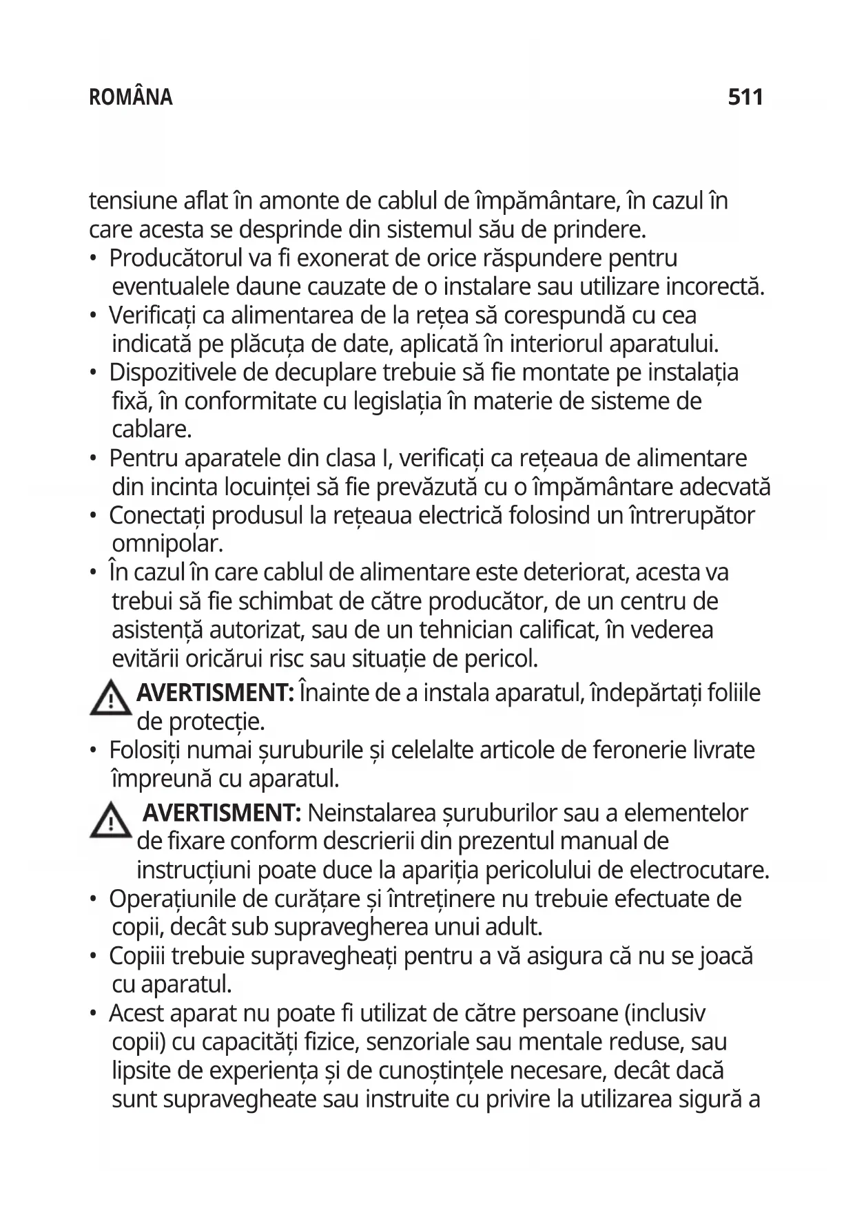 - Acest aparat nu poate fi utilizat de către persoane (inclusiv copii) cu capacităţi fizice, senzoriale sau mentale reduse, sau lipsite de experienţa și de cunoștinţele necesare, decât dacă sunt supravegheate sau instruite cu privire la utilizarea sigură a512 ROMÂNA aparatului, de către o persoană care răspunde de siguranţa lor.