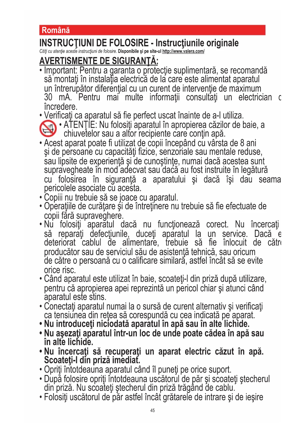 VALERA registrovaná obchodní značka společnosti LIGO PATENTS SA – Switzerland45 Română INSTRUCŢIUNI DE FOLOSIRE - Instrucţiunile originale Citiţi cu atenţie aceste instrucţiuni de folosire. Disponibile şi pe site-ul http://www.valera.com/ AVERTISMENTE DE SIGURANŢĂ: