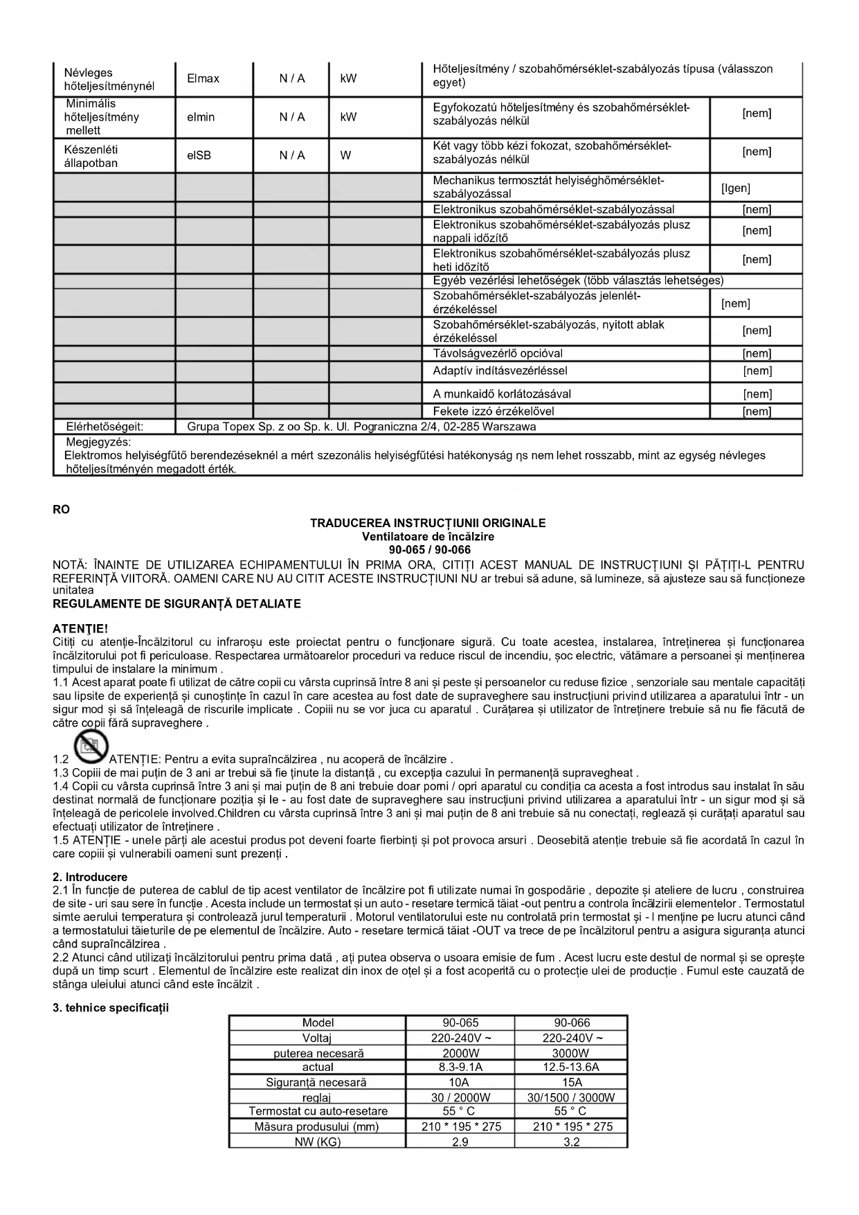 Identificator (e) de model: 90-066 Articol Simbol Valoare Unitate Articol Unitate Puterea de căldură Tipul de intrare de căldură, numai pentru încălzitoarele spațiale locale de stocare electrică (selectați una)Puterea nominală de căldură Pnom 3 kW Control manual de încărcare a căldurii cu termostat integrat [Nu] Puterea minimă de căldură (indicativ) Pmin 1.5 kW Control manual de încărcare a căldurii cu feedback de temperatură în cameră și / sau exterior [Nu] Puterea maximă de căldură continuă Pmax 3 kW Control electronic de încărcare a căldurii cu feedback de temperatură în cameră și / sau exterior [Nu] Consum auxiliar de energie electrică Producția de căldură asistată de fan [Nu] La puterea nominală de căldură Elmax N / A kW Tipul de energie termică / control al temperaturii camerei (selectați unul) La consum redus de căldură elmin N / A kW Puterea de căldură într-un singur stadiu și fără control al temperaturii camerei [Nu] În modul de așteptare elSB N / A W Două sau mai multe etape manuale, fără control al temperaturii camerei [Nu]