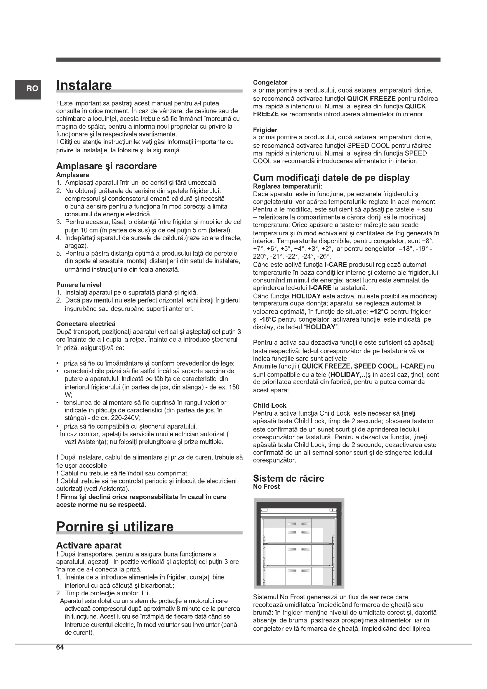 Aparatul este dotat cu un sistem de protecţie a motorului care activează compresorul după aproximativ 8 minute de la punerea în funcţiune. Acest lucru se întâmplă de ecare dată când se întrerupe curentul electric, în mod voluntar sau involuntar (pană de curent). Congelator a prima pornire a produsului, după setarea temperaturii dorite, se recomandă activarea funcţiei QUICK FREEZE pentru răcirea mai rapidă a interiorului. Numai la ieşirea din funcţia QUICK FREEZE se recomandă introducerea alimentelor în interior. Frigider a prima pornire a produsului, după setarea temperaturii dorite, se recomandă activarea funcţiei SPEED COOL pentru răcirea mai rapidă a interiorului. Numai la ieşirea din funcţia SPEED COOL se recomandă introducerea alimentelor în interior. Cum modicaţi datele de pe display Reglarea temperaturii: Dacă aparatul este în funcţiune, pe ecranele frigiderului şi congelatorului vor apărea temperaturile reglate în acel moment. Pentru a le modica, este sucient să apăsaţi pe tastele + sau – referitoare la compartimentele cărora doriţi să le modicaţi temperatura. Orice apăsare a tastelor măreşte sau scade temperatura şi în mod echivalent şi cantitatea de frig generată în interior. Temperaturile disponibile, pentru congelator, sunt +8°, +7°, +6°, +5°, +4°, +3°, +2°, iar pentru congelator: –18°, -19°,- 220°, -21°, -22°, -24°, -26°. Când este activă funcţia I-CARE produsul reglează automat temperaturile în baza condiţiilor interne şi externe ale frigiderului consumînd minimul de energie; acest lucru este semnalat de aprinderea led-ului I-CARE la tastatură. Când funcţia HOLIDAY este activă, nu este posibil să modicaţi temperatura după dorinţă; aparatul se reglează automat la valoarea optimală, în funcţie de situaţie: +12°C pentru frigider şi -18°C pentru congelator; activarea funcţiei este indicată, pe display, de led-ul “HOLIDAY”. Pentru a activa sau dezactiva funcţiile este sucient să apăsaţi tasta respectivă: led-ul corespunzător de pe tastatură vă va indica funcţiile sare sunt activate. Anumite funcţii ( QUICK FREEZE, SPEED COOL, I-CARE) nu sunt compatibile cu altele (HOLIDAY,..)ş în acest caz, ţineţi cont de prioritatea acordată din fabrică, pentru a putea comanda acest aparat. Child Lock Pentru a activa funcţia Child Lock, este necesar să ţineţi apăsată tasta Child Lock, timp de 2 secunde; blocarea tastelor este conrmată de un sunet scurt şi de aprinderea ledului corespunzător pe tastatură. Pentru a dezactiva funcţia, ţineţi apăsată tasta Child Lock, timp de 2 secunde; dezactivarea este conrmată de un alt semnal sonor scurt şi de stingerea ledului corespunzător. Sistem de răcire No Frost Sistemul No Frost generează un ux de aer rece care recoltează umiditatea împiedicând formarea de gheaţă sau brumă: în frigider menţine nivelul de umiditate corect şi, datorită absenţei de brumă, păstrează prospeţimea alimentelor, iar în congelator evită formarea de gheaţă, împiedicând deci lipireaRO