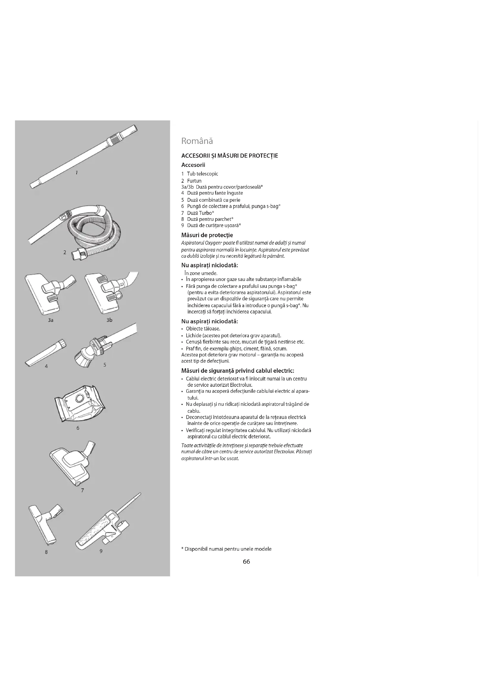 ACCESORII ȘI MĂSURI DE PROTECŢIE Accesorii 1 Tub telescopic 2 Furtun 3a/3b Duză pentru covor/pardoseală* 4 Duză pentru fante înguste 5 Duză combinată cu perie 6 Pungă de colectare a prafului, punga s‑bag® 7 Duză Turbo* 8 Duză pentru parchet* 9 Duză de curăţare ușoară* Măsuri de protecţie Aspiratorul Oxygen