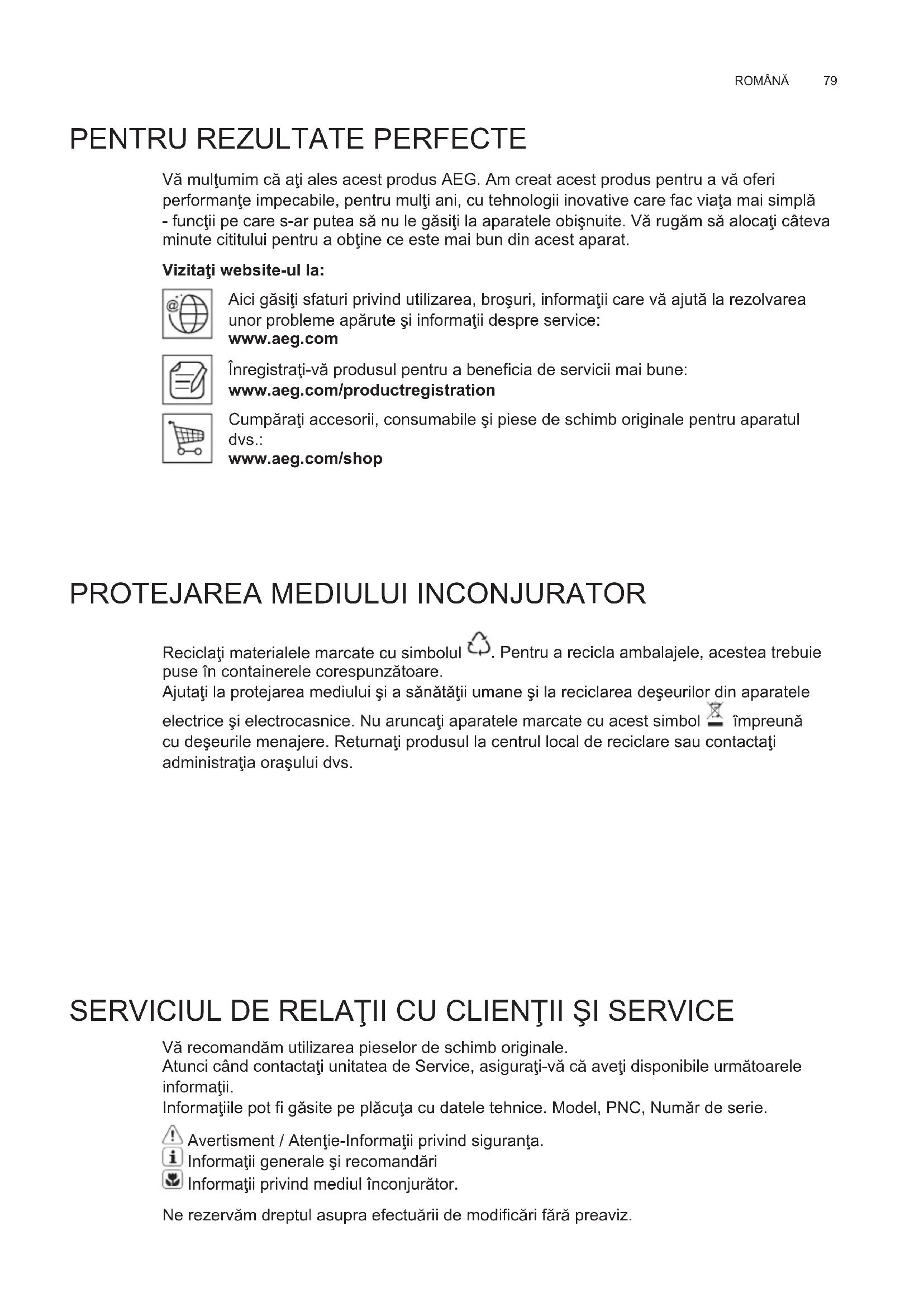 ReciclaIJi materialele marcate cu simbolul . Pentru a recicla ambalajele, acestea trebuie puse în containerele corespunzĕtoare. AjutaIJi la protejarea mediului Βi a sĕnĕtĕIJii umane Βi la reciclarea deΒeurilor din aparatele electrice Βi electrocasnice. Nu aruncaIJi aparatele marcate cu acest simbol împreunĕ cu deΒeurile menajere. ReturnaIJi produsul la centrul local de reciclare sau contactaIJi administraIJia oraΒului dvs. SERVICIUL DE RELAıII CU CLIENıII ΑI SERVICE Vĕ recomandĕm utilizarea pieselor de schimb originale. Atunci când contactaIJi unitatea de Service, asiguraIJi-vĕ cĕ aveIJi disponibile urmĕtoarele informaIJii. InformaIJiile pot fi gĕsite pe plĕcuIJa cu datele tehnice. Model, PNC, Numĕr de serie. Avertisment / AtenIJie-InformaIJii privind siguranIJa. InformaIJii generale Βi recomandĕri InformaIJii privind mediul înconjurĕtor. Ne rezervĕm dreptul asupra efectuĕrii de modificĕri fĕrĕ preaviz. RO MANUAL DE FOLOSIREwww.aeg.com