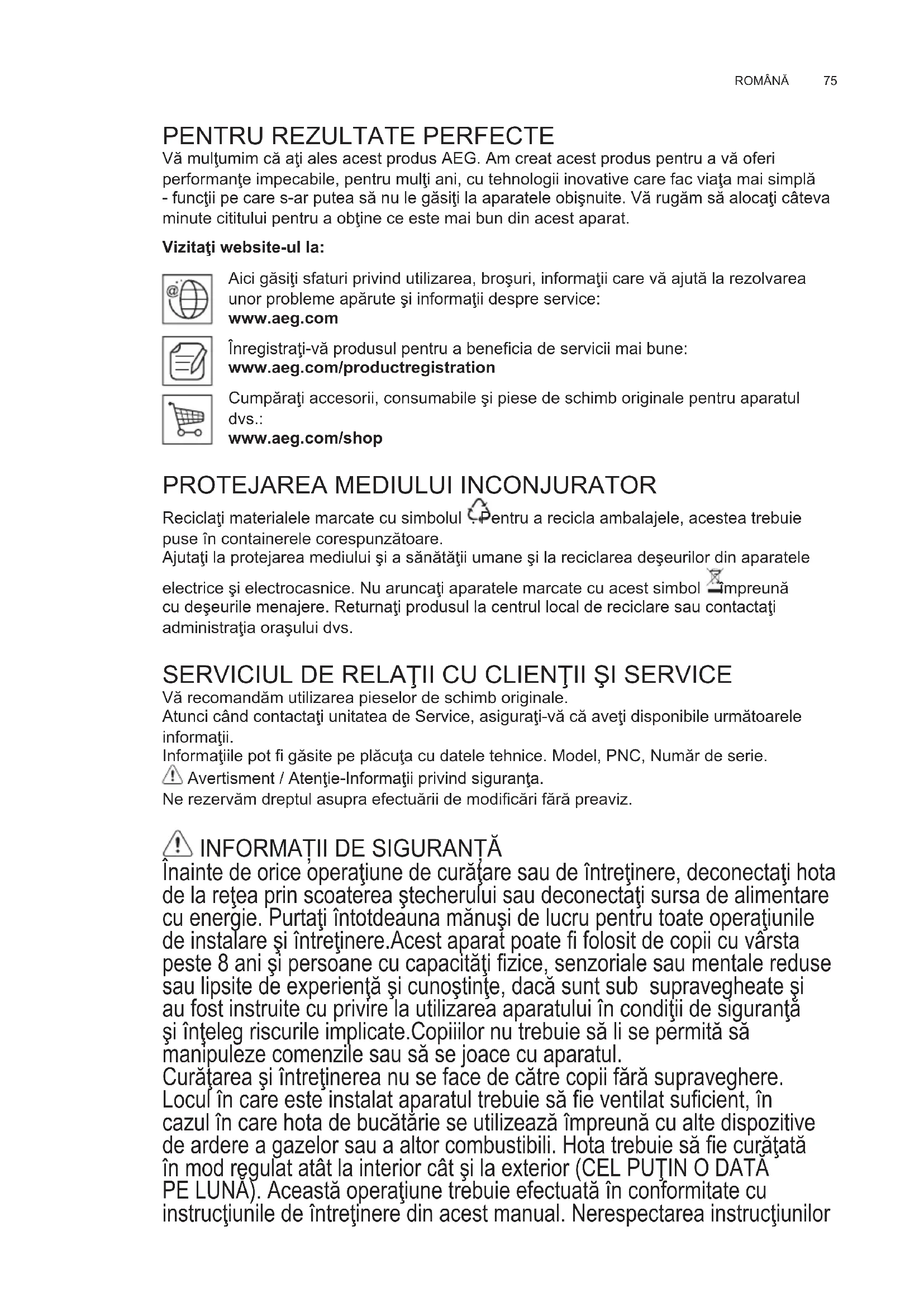 Vă mulţumim că aţi ales acest produs AEG. Am creat acest produs pentru a vă oferi performanţe impecabile, pentru mulţi ani, cu tehnologii inovative care fac viaţa mai simplă - funcţii pe care s-ar putea să nu le găsiţi la aparatele obişnuite. Vă rugăm să alocaţi câteva minute cititului pentru a obţine ce este mai bun din acest aparat. Vizitaţi website-ul la: Aici găsiţi sfaturi privind utilizarea, broşuri, informaţii care vă ajută la rezolvarea unor probleme apărute şi informaţii despre service: www.aeg.com Înregistraţi-vă produsul pentru a benecia de servicii mai bune: www.aeg.com/productregistration Cumpăraţi accesorii, consumabile şi piese de schimb originale pentru aparatul dvs.: www.aeg.com/shop
