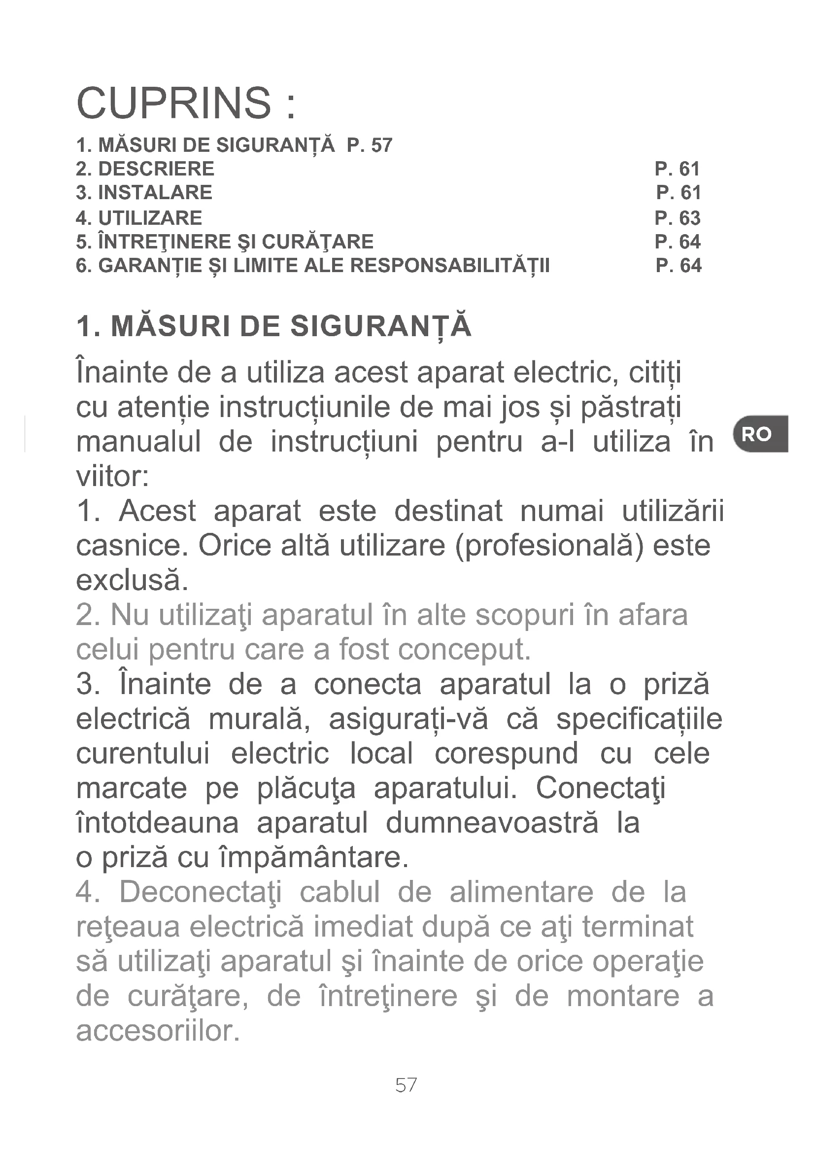 reţeaua electrică imediat după ce aţi terminat să utilizaţi aparatul şi înainte de orice operaţie de curăţare, de întreţinere şi de montare a accesoriilor. CUPRINS :
