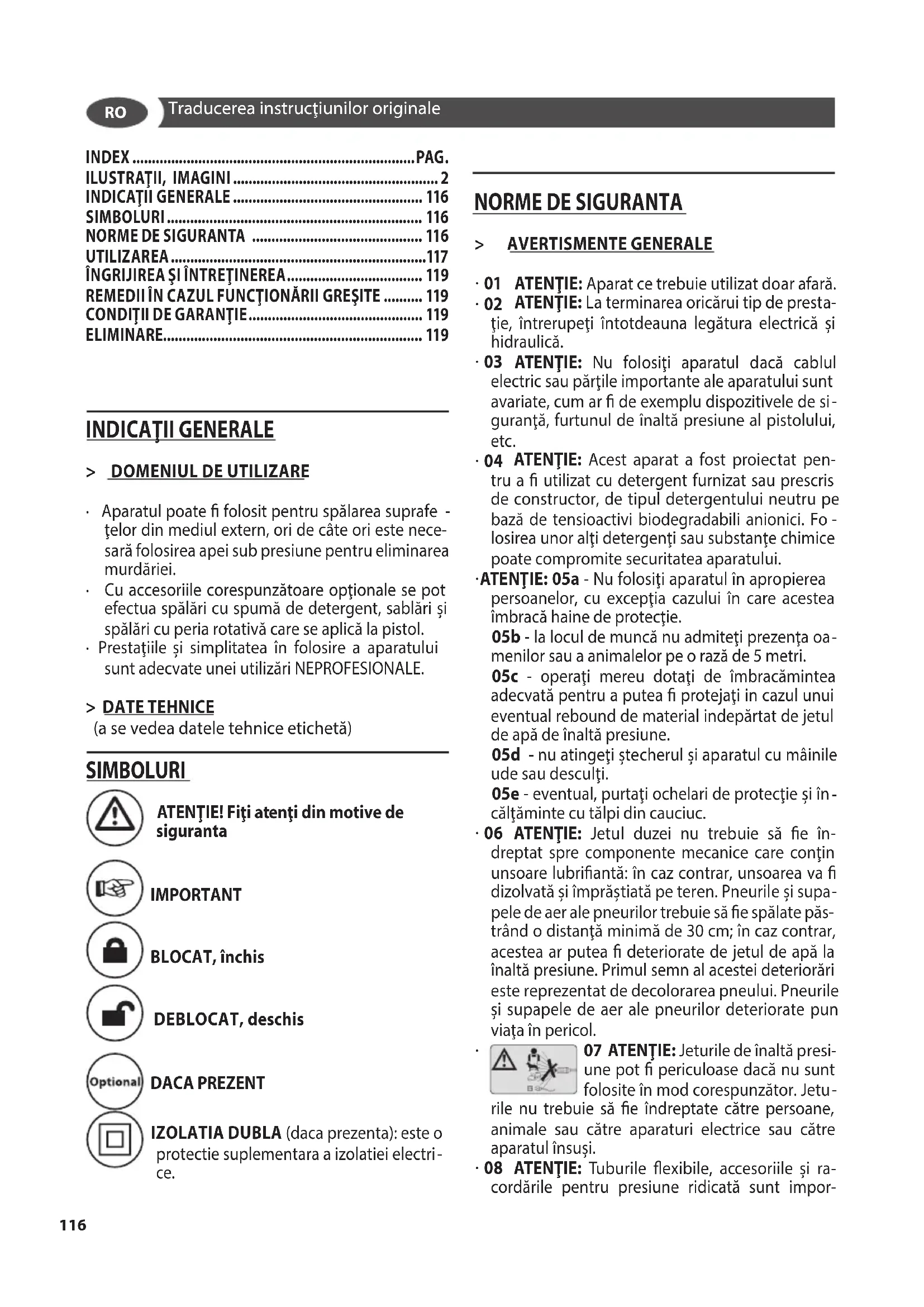 - 08 ATENŢIE: Tuburile exibile, accesoriile şi ra- cordările pentru presiune ridicată sunt impor- INDEX .........................................................................PAG.