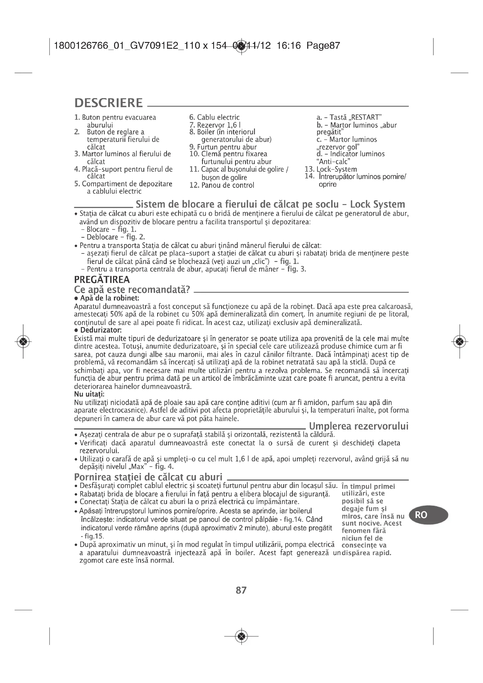1800126766_01_GV7091E2_110 x 154 06/11/12 16:16 Page8990 Dacă nu este posibil să determinaţi cauza unei pene, adresaţi-vă unui centru de service autorizat. Probleme Cauze posibile Soluţii Centrala de abur nu porneşte sau martorul lumi- nos al fierului de călcat nu este aprins. Aparatul nu este sub tensiune. Verifica—i dacã aparatul este conectat, în mod corect, la o prizã în stare de func—ionare …i dacã este sub tensiune (întrerupãtor luminos de ornire/oprire aprins). Apa curge prin orificiile de pe talpă. Utilizaţi abur când fierul dumneavoastră de călcat nu este suficient de cald. Apa s-a condensat în conducte deoarece utiliza—i aburul pentru prima datã sau nu l-a—i utilizat de mai mult timp. Verificaţi reglajul termostatului. Aşteptaţi ca martorul luminos al fierului de călcat să se stingă înainte de a acţiona butonul de evacuarea a aburului. Apăsaţi butonul de evacuare a aburului fără a îndrepta fierul de călcat înspre masa de călcat, până când fierul de călcat va în- cepe să degaje abur. Pe rufe, apar urme de apă. Husa de pe masa de călcat este saturată cu apă, pentru că nu este adaptată puterii unei centrale de abur. Asiguraţi-vă că folosiţi o masă potrivită (platou cu grilaj care evită condensul). Se scurge o substanţă albă prin orificiile de pe talpa fie- rului de călcat. Boilerul dumneavoastră elimină calcar, deoarece nu a fost clătit cu regularitate. Clătirea boilerului (vezi capitolul refe- ritor la detartrarea centralei). Se scurge o substanţă ma- ronie prin orificiile de pe talpa fierului de călcat care pătează rufele. Utilizaţi produse chimice pentru detar- trare sau aditivi în apa pe care o folosiţi pentru călcat. Nu adăugaţi niciodată niciun fel de produs în rezervor (vezi secţiunea „Ce apă este recomandată?”). Talpa este murdară sau maronie şi ar putea păta rufele. Utilizaţi fierul de călcat la o temperatură prea ridicată. Rufele dumneavoastră nu au fost clătite suficient sau aţi călcat un obiect de îmbrăcăminte nou înainte de a-l spăla. Utilizaţi amidon. Consultaţi sfaturile noastre cu privire la reglarea temperaturilor. Asiguraţi-vă că rufele sunt suficient de bine clătite pentru a elimina eventualele depuneri de săpun sau de produse chimice pe îmbrăcămintea nouă. Pulverizaţi întotdeauna amidonul pe faţa opusă celei pe care urmează să o călcaţi. Cantitatea de abur este mică sau nu este evacuat abur deloc. Rezervorul este gol (indicatorul luminos roşu luminează intermitent). Temperatura tălpii este reglată la nivelul maxim. Umpleţi rezervorul şi apăsaţi tasta „RESTART” până când martorul lumi- nos se stinge. Centrala de abur funcţionează normal, dar aburul, fiind foarte cald, este uscat, aşadar mai puţin vizibil. Iese abur în jurul buşonului. Colectorul nu este strâns corespunzãtor. Garnitura colectorului este deterioratã. Aparatul este defect. Strângeţi colectorul din nou. Contactaţi un centru de service autorizat. Nu mai utilizaţi centrala de abur şi contactaţi un centru de service autorizat. Indicatorul luminos roşu “rezervor de apă gol” lumi- nează intermitent. Nu aţi apăsat tasta de repornire „RE- START”. Apăsaţi butonul “RESTART” de repornire situat pe panoul de bord până când indi- catorul luminos se stinge. Se elimină abur sau apă în partea inferioară a aparatu- lui. Aparatul este defect. Nu mai utilizaţi centrala de abur şi contactaţi un centru de service autorizat. Indicatorul luminos “anti calc” lumineaz ă intermitent. Nu a—i apãsat butonul de repornire “RESTART”. Apăsaţi butonul “RESTART” de repornire situat pe panoul de bord până când indicatorul luminos se stinge. AVEŢI O PROBLEMĂ CU CENTRALA DUMNEAVOASTRĂ DE ABUR? 1800126766_01_GV7091E2_110 x 154 06/11/12 16:16 Page9091 Süsteem triikraua lukustamiseks selle alusele - Lock System