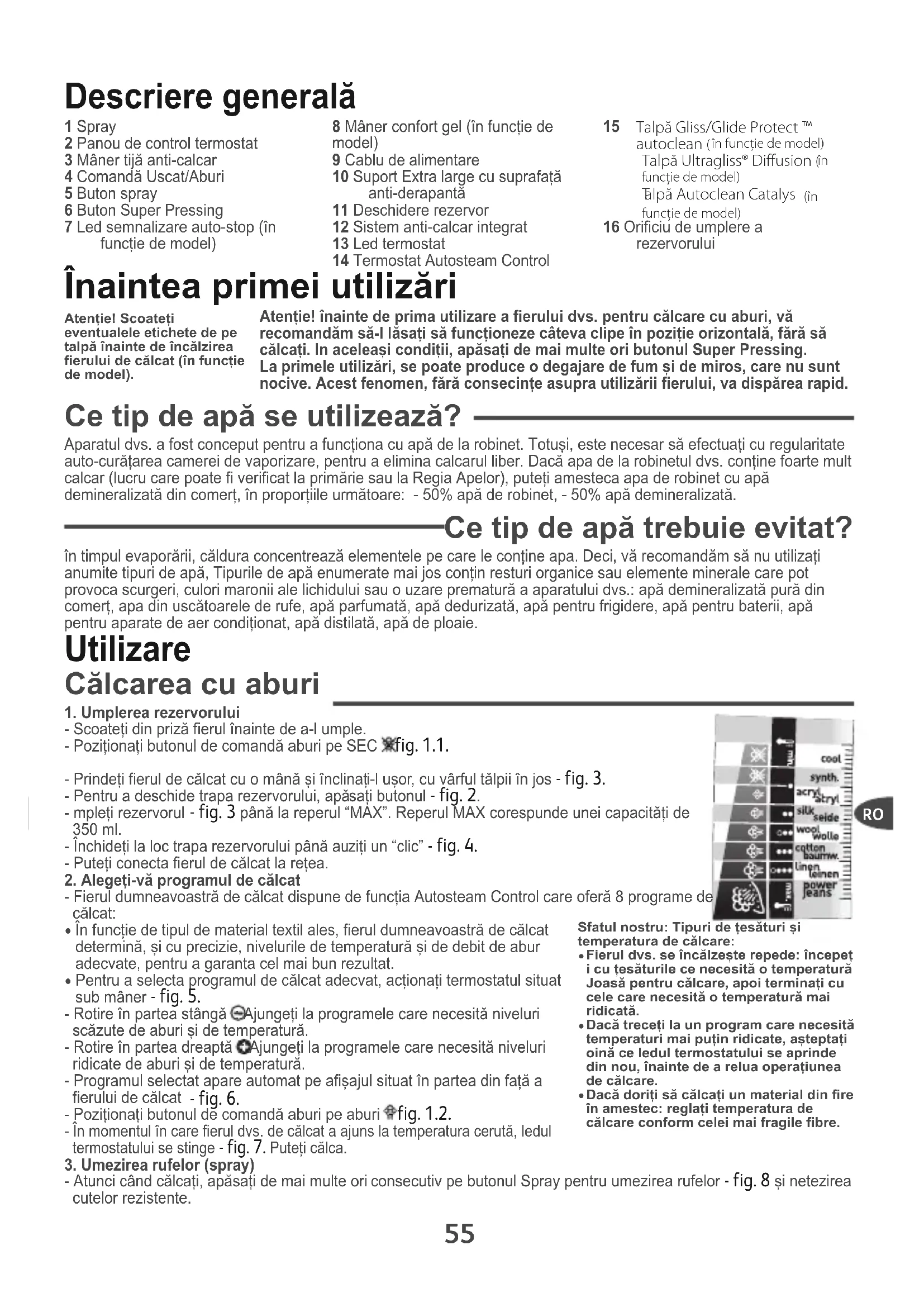 - Fierul de cãlcat rãmâne nemi…cat mai mult de 8 minute pe cãlcâi.• Fierul de cãlcat rãmâne a…ezat pe talpã sau în lateral timp de peste 30 de secunde.- Pentru a repune fierul în func—iune, este suficient sã-l mi…ca—i u…or, pânã când ledul nu mai clipe…te. Talpă Gliss/Glide Protect autoclean - Autoclean Catalys (în funcţie de model) • Fierul dumneavoastră este echipat cu o talpă cu autocurăţare, care funcţionează printr-un proces de cataliză.• Suprafaţa sa de acoperire unică permite eliminarea tuturor impurităţilor generate de utilizarea normală.• Vă recomandăm să aşezaţi întotdeauna fierul pe suport pentru menţinerea suprafeţei de acoperire cu autocurăţare. Cãlcarea rufelor pe uscat - Alege—i-vã programul de cãlcat.- Pune—i comanda de aburi pe pozi—ia SEC - fig. 1.1.- Pute—i cãlca atunci când ledul este stins. Între—inerea fierului de cãlcat ATENfiIE! Scoate—i fierul din prizã …i lãsa—ii sã se rãceascã, înainte de a-l curã—a. Curã—a—i tija anti-calcar (o datã pe lunã) - Scoate—i fierul din prizã …i goli—i rezervorul.- Pentru a îndepãrta tija anti-calcar, regla—i termostatul dumneavoastrã în pozi—ia MAX - fig. 10, pozi—iona—i comanda pentru abur în pozi—ia “VAPEUR” fig. 1.2, moment în care tija fierului dumneavoastrã de cãlcat poate fi scoasã - fig. 15. Nu atinge—i niciodatã extremitatea tijei - Lãsa—i tija timp de 4 ore într-un vas cu amestec de o—et …i alcool alb, sau în suc natural de lãmâie - fig. 16. - Clãti—i tija sub jet de apã, la robinet.- Pune—i tija anti-calcar la loc. Fierul nu func—ioneazã fãrã tija anti-calcar 1. Efectua—i o auto-curã—are : Pentru a prelungi durata de via—ã a fierului dvs. de cãlcat,efectua—i o auto-curã—are, o datã pe lunã.- Pune—i comanda de aburi pe pozi—ia SEC - fig. 1.1. - Pozi—iona—i fierul de cãlcat pe cãlcâi cu rezervorul plin …i regla—i termostatul în pozi—ia MAX - fig. 10. - Dupã ce ledul s-a stins, scoate—i fierul din prizã …i pune—i-l deasupra unei chiuvete.- Ridica—i tija anti-calcar.- Setaţi controlul aburului pe poziţia STEAM (fig 1.2.) - Agita—i u…or fierul deasupra chiuvetei, în pozi—ie orizontalã, pânã ce o parte din apã (cu impuritã—i) se scurge prin talpa fierului de cãlcat.- La terminarea opera—iei, împinge—i la loc tija anti-calcar.- Pune—i din nou fierul în prizã timp de 2 minute, în pozi—ie verticalã, pentru a usca talpa.- Scoate—i fierul din prizã când talpa s-a rãcit pu—in, …i …terge—i-l cu o cârpã moale.2. Curã—a—i talpa fieruluiFierul dumneavoastră de călcat cu abur este echipat cu o talpă cu autocurăţare (în funcţie de model):