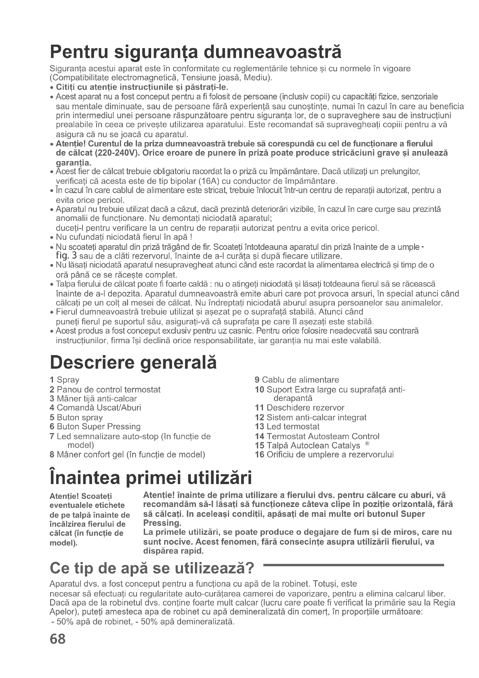 - Acest produs a fost conceput exclusiv pentru uz casnic. Pentru orice folosire neadecvatã sau contrarã instruc—iunilor, firma î…i declinã orice responsabilitate, iar garan—ia nu mai este valabilã. Descriere generalã 1 Spray2 Panou de control termostat3 Mâner tijã anti-calcar4 Comandã Uscat/Aburi5 Buton spray6 Buton Super Pressing7 Led semnalizare auto-stop (în func—ie demodel)8 Mâner confort gel (în func—ie de model)9 Cablu de alimentare10 Suport Extra large cu suprafa—ã anti-derapantã11 Deschidere rezervor12 Sistem anti-calcar integrat13 Led termostat14 Termostat Autosteam Control15 Talpã Autoclean Catalys 16 Orificiu de umplere a rezervorului Înaintea primei utilizãri Aten—ie! înainte de prima utilizare a fierului dvs. pentru cãlcare cu aburi, vãrecomandãm sã-l lãsa—i sã func—ioneze câteva clipe în pozi—ie orizontalã, fãrãsã cãlca—i. In acelea…i condi—ii, apãsa—i de mai multe ori butonul SuperPressing.La primele utilizãri, se poate produce o degajare de fum …i de miros, care nusunt nocive. Acest fenomen, fãrã consecin—e asupra utilizãrii fierului, vadispãrea rapid. Ce tip de apã se utilizeazã? Aparatul dvs. a fost conceput pentru a func—iona cu apã de la robinet. Totu…i, este necesar sã efectua—i cu regularitate auto-curã—area camerei de vaporizare, pentru a elimina calcarul liber.Dacã apa de la robinetul dvs. con—ine foarte mult calcar (lucru care poate fi verificat la primãrie sau la RegiaApelor), pute—i amesteca apa de robinet cu apã demineralizatã din comer—, în propor—iile urmãtoare:- 50% apã de robinet, - 50% apã demineralizatã.Aten—ie! Scoate—ieventualele etichetede pe talpã înainte deîncãlzirea fierului decãlcat (în func—ie demodel). UltimateAutoclean-1800113015-110x154:Mise en page 1 23/07/08 9:18 Page 6869 Ce tip de apã trebuie evitat? în timpul evaporãrii, cãldura concentreazã elementele pe care le con—ine apa. Deci, vã recomandãm sã nuutiliza—i anumite tipuri de apã, Tipurile de apã enumerate mai jos con—in resturi organice sau elemente minerale care pot provoca scurgeri, culori maronii ale lichidului sau ouzare prematurã a aparatului dvs.: apã demineralizatã purã din comer—, apa din uscãtoarele de rufe, apã parfumatã, apã dedurizatã, apã pentru frigidere, apã pentru baterii,apã pentru aparate de aer condi—ionat, apã distilatã, apã de ploaie. Utilizare Cãlcarea cu aburi 1. Umplerea rezervorului- Scoate—i din prizã fierul înainte de a-l umple.- Pozi—iona—i butonul de comandã aburi pe SEC - fig. 1. - Prinde—i fierul de cãlcat cu o mânã …i înclina—i-l u…or, cu vârful tãlpii în jos - fig. 3. - Pentru a deschide trapa rezervorului, apãsa—i butonul - fig. 2. - mple—i rezervorul - fig. 3 pânã la reperul “MAX”. Reperul MAX corespunde unei capacitã—i de 350 cm3.- Închide—i la loc trapa rezervorului pânã auzi—i un “clic” - fig. 4.- Pute—i conecta fierul de cãlcat la re—ea.2. Alege—i-vã programul de cãlcat- Fierul dumneavoastrã de cãlcat dispune de func—ia Autosteam Control care oferã 8programe de cãlcat: