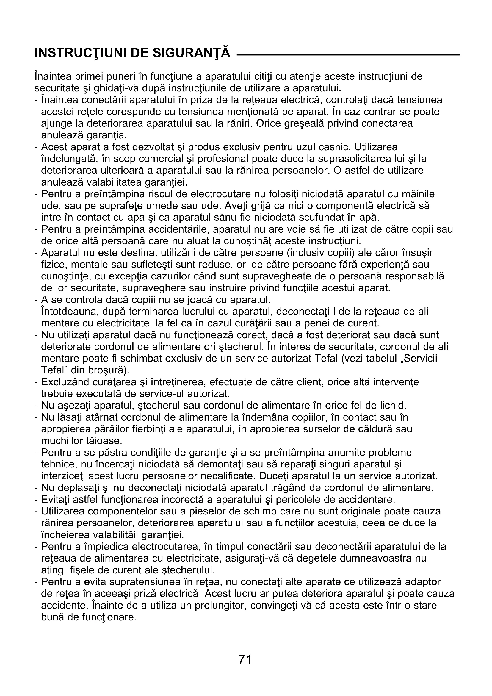Înaintea primei puneri în funcţiune a aparatului citiţi cu atenţie aceste instrucţiuni de securitate şi ghidaţi-vă după instrucţiunile de utilizare a aparatului. - Înaintea conectării aparatului în priza de la reţeaua electrică, controlaţi dacă tensiunea acestei reţele corespunde cu tensiunea menţionată pe aparat. În caz contrar se poate ajunge la deteriorarea aparatului sau la răniri. Orice greşeală privind conectarea anulează garanţia. - Acest aparat a fost dezvoltat şi produs exclusiv pentru uzul casnic. Utilizarea îndelungată, în scop comercial şi profesional poate duce la suprasolicitarea lui şi la deteriorarea ulterioară a aparatului sau la rănirea persoanelor. O astfel de utilizare anulează valabilitatea garanţiei. - Pentru a preîntâmpina riscul de electrocutare nu folosiţi niciodată aparatul cu mâinile ude, sau pe suprafeţe umede sau ude. Aveţi grijă ca nici o componentă electrică să intre în contact cu apa şi ca aparatul sănu fie niciodată scufundat în apă. - Pentru a preîntâmpina accidentările, aparatul nu are voie să fie utilizat de către copii sau de orice altă persoană care nu aluat la cunoştinăţ aceste instrucţiuni. - Aparatul nu este destinat utilizării de către persoane (inclusiv copiii) ale căror însuşir fizice, mentale sau sufleteşti sunt reduse, ori de către persoane fără experienţă sau cunoştinţe, cu excepţia cazurilor când sunt supravegheate de o persoană responsabilă de lor securitate, supraveghere sau instruire privind funcţiile acestui aparat. - A se controla dacă copiii nu se joacă cu aparatul. - Întotdeauna, după terminarea lucrului cu aparatul, deconectaţi-l de la reţeaua de ali mentare cu electricitate, la fel ca în cazul curăţării sau a penei de curent. - Nu utilizaţi aparatul dacă nu funcţionează corect, dacă a fost deteriorat sau dacă sunt deteriorate cordonul de alimentare ori ştecherul. În interes de securitate, cordonul de ali mentare poate fi schimbat exclusiv de un service autorizat Tefal (vezi tabelul „Servicii Tefal” din broşură). - Excluzând curăţarea şi întreţinerea, efectuate de către client, orice altă intervenţe trebuie executată de service-ul autorizat. - Nu aşezaţi aparatul, ştecherul sau cordonul de alimentare în orice fel de lichid. - Nu lăsaţi atârnat cordonul de alimentare la îndemâna copiilor, în contact sau în apropierea părăilor fierbinţi ale aparatului, în apropierea surselor de căldură sau muchiilor tăioase. - Pentru a se păstra condiţiile de garanţie şi a se preîntâmpina anumite probleme tehnice, nu încercaţi niciodată să demontaţi sau să reparaţi singuri aparatul şi interziceţi acest lucru persoanelor necalificate. Duceţi aparatul la un service autorizat. - Nu deplasaţi şi nu deconectaţi niciodată aparatul trăgând de cordonul de alimentare. - Evitaţi astfel funcţionarea incorectă a aparatului şi pericolele de accidentare. - Utilizarea componentelor sau a pieselor de schimb care nu sunt originale poate cauza rănirea persoanelor, deteriorarea aparatului sau a funcţiilor acestuia, ceea ce duce la încheierea valabilităii garanţiei. - Pentru a împiedica electrocutarea, în timpul conectării sau deconectării aparatului de la reţeaua de alimentarea cu electricitate, asiguraţi-vă că degetele dumneavoastră nu ating fişele de curent ale ştecherului. - Pentru a evita supratensiunea în reţea, nu conectaţi alte aparate ce utilizează adaptor de reţea în aceeaşi priză electrică. Acest lucru ar putea deteriora aparatul şi poate cauza accidente. Înainte de a utiliza un prelungitor, convingeţi-vă că acesta este într-o stare bună de funcţionare.