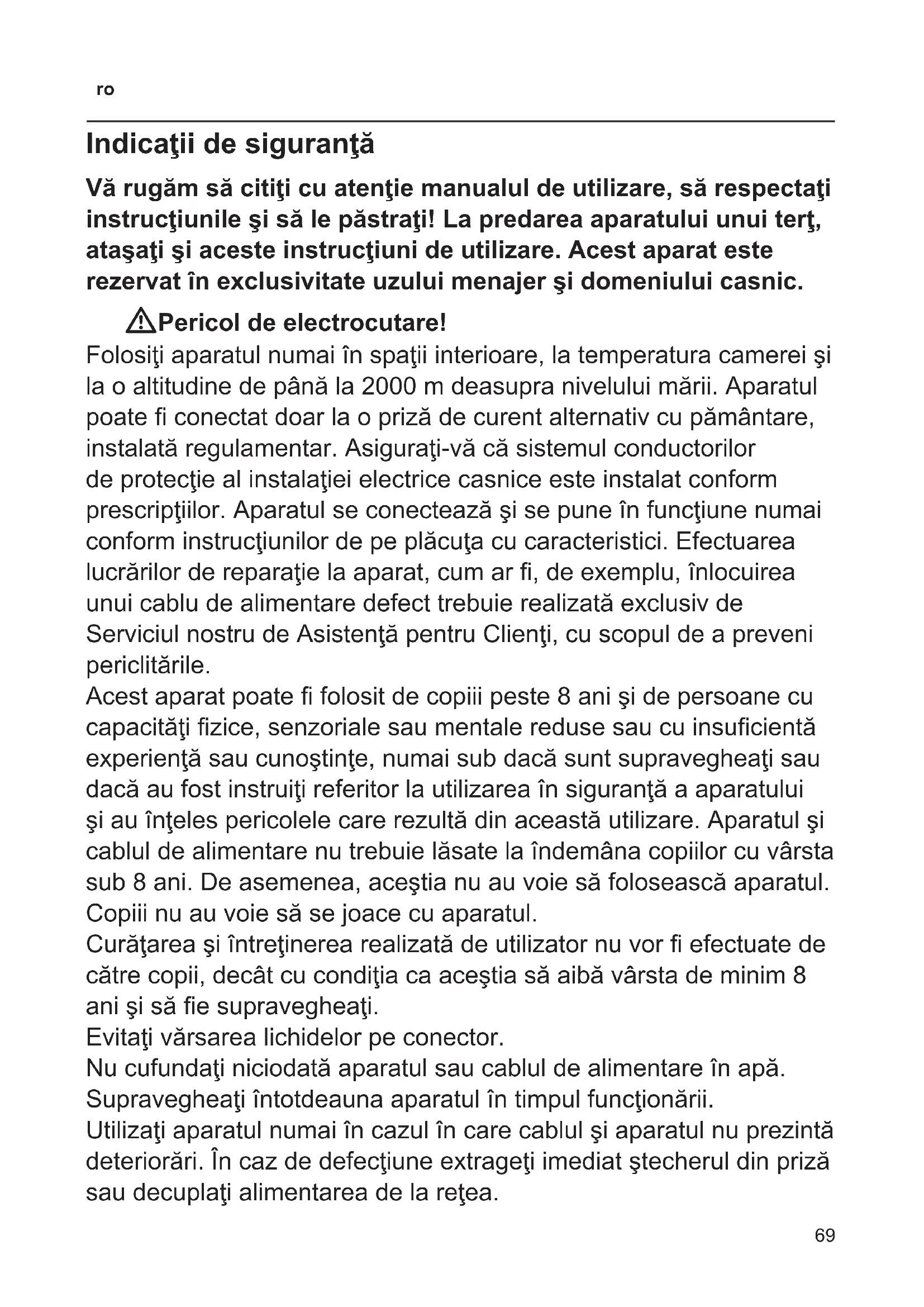 Indicaţii de siguranţă Vă rugăm să citiţi cu atenţie manualul de utilizare, să respectaţi instrucţiunile şi să le păstraţi! La predarea aparatului unui terţ, ataşaţi şi aceste instrucţiuni de utilizare. Acest aparat este rezervat în exclusivitate uzului menajer şi domeniului casnic. WPericol de electrocutare! Folosiţi aparatul numai în spaţii interioare, la temperatura camerei şi la o altitudine de până la 2000 m deasupra nivelului mării. Aparatul poate conectat doar la o priză de curent alternativ cu pământare, instalată regulamentar. Asiguraţi-vă că sistemul conductorilor de protecţie al instalaţiei electrice casnice este instalat conform prescripţiilor. Aparatul se conectează şi se pune în funcţiune numai conform instrucţiunilor de pe plăcuţa cu caracteristici. Efectuarea lucrărilor de reparaţie la aparat, cum ar , de exemplu, înlocuirea unui cablu de alimentare defect trebuie realizată exclusiv de Serviciul nostru de Asistenţă pentru Clienţi, cu scopul de a preveni periclitările. Acest aparat poate folosit de copiii peste 8 ani şi de persoane cu capacităţi zice, senzoriale sau mentale reduse sau cu insucientă experienţă sau cunoştinţe, numai sub dacă sunt supravegheaţi sau dacă au fost instruiţi referitor la utilizarea în siguranţă a aparatului şi au înţeles pericolele care rezultă din această utilizare. Aparatul şi cablul de alimentare nu trebuie lăsate la îndemâna copiilor cu vârsta sub 8 ani. De asemenea, aceştia nu au voie să folosească aparatul. Copiii nu au voie să se joace cu aparatul. Curăţarea şi întreţinerea realizată de utilizator nu vor efectuate de către copii, decât cu condiţia ca aceştia să aibă vârsta de minim 8 ani şi să e supravegheaţi. Evitaţi vărsarea lichidelor pe conector. Nu cufundaţi niciodată aparatul sau cablul de alimentare în apă. Supravegheaţi întotdeauna aparatul în timpul funcţionării. Utilizaţi aparatul numai în cazul în care cablul şi aparatul nu prezintă deteriorări. În caz de defecţiune extrageţi imediat ştecherul din priză sau decuplaţi alimentarea de la reţea.70
