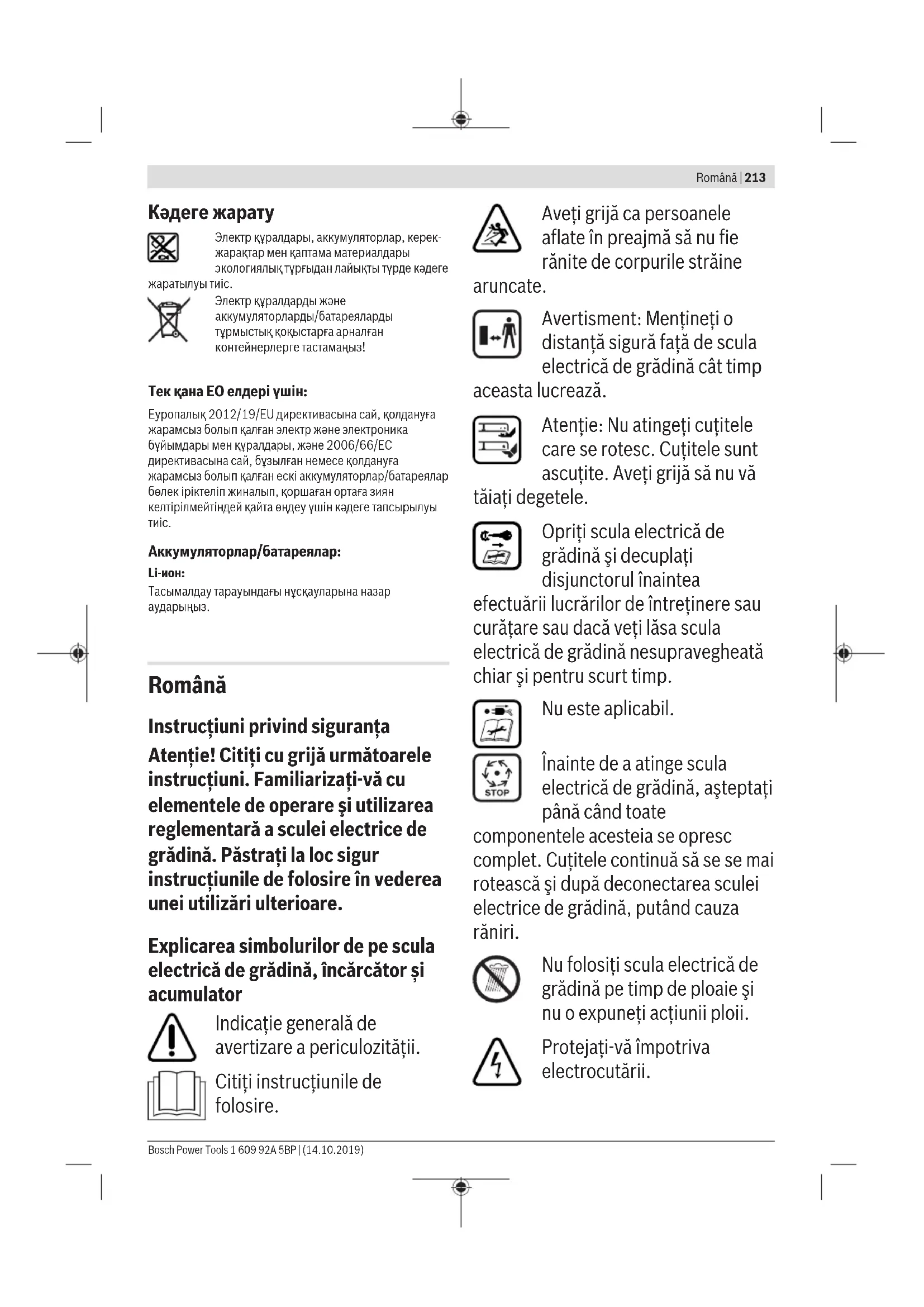 Română Instrucţiuni privind siguranţa Atenție! Citiţi cu grijă următoarele instrucţiuni. Familiarizaţi-vă cu elementele de operare şi utilizarea reglementară a sculei electrice de grădină. Păstraţi la loc sigur instrucţiunile de folosire în vederea unei utilizări ulterioare. Explicarea simbolurilor de pe scula electrică de grădină, încărcător și acumulator Indicaţie generală de avertizare a periculozităţii. Citiţi instrucţiunile de folosire. Aveţi grijă ca persoanele aflate în preajmă să nu fie rănite de corpurile străine aruncate. Avertisment: Menţineţi o distanţă sigură faţă de scula electrică de grădină cât timp aceasta lucrează. Atenţie: Nu atingeţi cuţitele care se rotesc. Cuţitele sunt ascuţite. Aveţi grijă să nu vă tăiaţi degetele. Opriţi scula electrică de grădină şi decuplaţi disjunctorul înaintea efectuării lucrărilor de întreţinere sau curăţare sau dacă veţi lăsa scula electrică de grădină nesupravegheată chiar şi pentru scurt timp. Nu este aplicabil. Înainte de a atinge scula electrică de grădină, aşteptaţi până când toate componentele acesteia se opresc complet. Cuţitele continuă să se se mai rotească şi după deconectarea sculei electrice de grădină, putând cauza răniri. Nu folosiţi scula electrică de grădină pe timp de ploaie şi nu o expuneţi acţiunii ploii. Protejaţi-vă împotriva electrocutării. Bosch Power Tools 1 609 92A 5BP | (14.10.2019)214 | Română Nu este aplicabil. Folosiţi încărcătorul numai în spaţii uscate. Încărcătorul este echipat cu un transformator de siguranţă. Nu folosiţi o maşină de curăţat cu înaltă presiune sau un furtun de grădină pentru curăţarea sculei electrice de grădină. Verificați atent dacă în zona în care va fi folosită scula electrică de grădină nu se află animale sălbatice și de casă. Animalele săbatice și cele de casă pot fi rănite în timpul exploatării mașinii. Verificați temeinic zona de lucru a mașinii și îndepărtați toate pietrele, bețele, sârmele, oasele și obiectele străine. În timpul utilizării mașinii aveți grijă ca în iarba deasă să nu se ascundă animale sălbatice, de casă sau mici cioturi de copaci. Manevrare u Nu permiteţi niciodată copiilor sau persoanelor nefamiliarizate cu prezentele instrucţiuni, să folosească scula electrică. Este posibil ca reglementările locale să limiteze vârsta operatorului. În caz de nefolosire, păstraţi scula electrică la loc inaccesibil copiilor. u Nu permiteţi în niciun caz copiilor, persoanelor cu capacităţi fizice, senzoriale sau intelectuale limitate sau lipsite de experienţă şi/sau cunoştinţe şi/sau persoanelor nefamiliarizate cu prezentele instrucţiuni, să folosească scula electrică de grădină. u Copiii trebuie supravegheaţi pentru a avea siguranţa că aceştia nu se joacă cu scula electrică. u Nu folosiţi în niciun caz scula electrică de grădină atunci când în imediata apropiere se află persoane, în special copii sau animale de casă. u Operatorul este ţinut răspunzător pentru accidente sau pagube provocate altor oameni sau bunurilor acestora. u Nu purtați pantofi sau sandale deschise din cauciuc atunci când folosiți scula electrică. Purtaţi încălţăminte solidă şi pantaloni lungi. u Inspectaţi atent suprafaţa pe care urmează să o lucraţi şi îndepărtaţi cu grijă pietrele, beţele, sârmele, oasele şi alte corpuri străine. u Înainte de utilizare verificaţi vizual întotdeauna dacă, cuţitele, şuruburile cuţitelor cât şi blocul de cuţite nu sunt uzate sau deteriorate. Pentru evitarea dezechilibrelor, înlocuiţi întotdeauna întregul set de cuţite şi şuruburi de cuţite uzate sau deteriorate. u Cosiţi numai la lumina zilei sau la lumină artificială bună. u În condiţii meteo nefavorabile în special în caz de furtună, nu lucraţi cu maşina de tuns iarba. 1 609 92A 5BP | (14.10.2019) Bosch Power ToolsRomână | 215 u Pe cât posibil nu folosiţi scula electrică de grădină la tunderea ierbii ude. u Păşiţi întotdeauna încet, nu alergaţi niciodată repede. u Nu folosiţi în niciun caz scula electrică de grădină dacă aceasta prezintă dispozitive de protecţie, capace defecte sau echipamente de siguranţă care lipsesc, ca de exemplu bara de protecţie sau coşul colector de iarbă. u Pentru propria dumneavoastră protecţie, vă recomandăm să purtaţi căşti antizgomot. u Nu folosiți scula electrică dacă sunteți obosiți sau bolnavi sau vă aflați sub influența alcoolului, a drogurilor sau a medicamentelor. u Cosirea ierbii pe taluzuri poate fi periculoasă: – Nu cosiţi în pantă foarte abruptă. – Fiţi întotdeauna atenţi, astfel încât să păşiţi în siguranţă pe suprafeţele înclinate sau pe iarba udă. – Pe suprafeţele înclinate cosiţi întotdeauna transversal şi niciodată în sus şi în jos. – La schimbarea direcţiei în pante fiţi extrem de precauţi. u Fiţi extrem de precauţi atunci când mergeţi înapoi cu scula electrică de grădină sau o trageţi spre dumneavoastră. u În timpul cosirii împingeţi scula electrică de grădină întotdeauna spre înainte şi nu o trageţi niciodată în direcţia corpului dumneavoastră. u Cuţitele trebuie să se afle în repaus, atunci când sunteţi nevoiţi să răsturnaţi scula electrică de grădină în vederea transportului, când traversaţi suprafeţe neplantate cu iarbă şi când transportaţi scula electrică spre şi de la sectorul de cosit. u Nu înclinaţi scula electrică de grădină la demarare sau în momentul pornirii motorului. u Porniţi scula electrică de grădină conform celor descrise în instrucţiunile de folosire şi aveţi grijă să vă ţineţi picioarele departe de piesele care se rotesc. u Nu ţineţi mâinile şi picioarele în apropierea sau sub piesele care se rotesc. u Păstraţi o distanţă sigură f