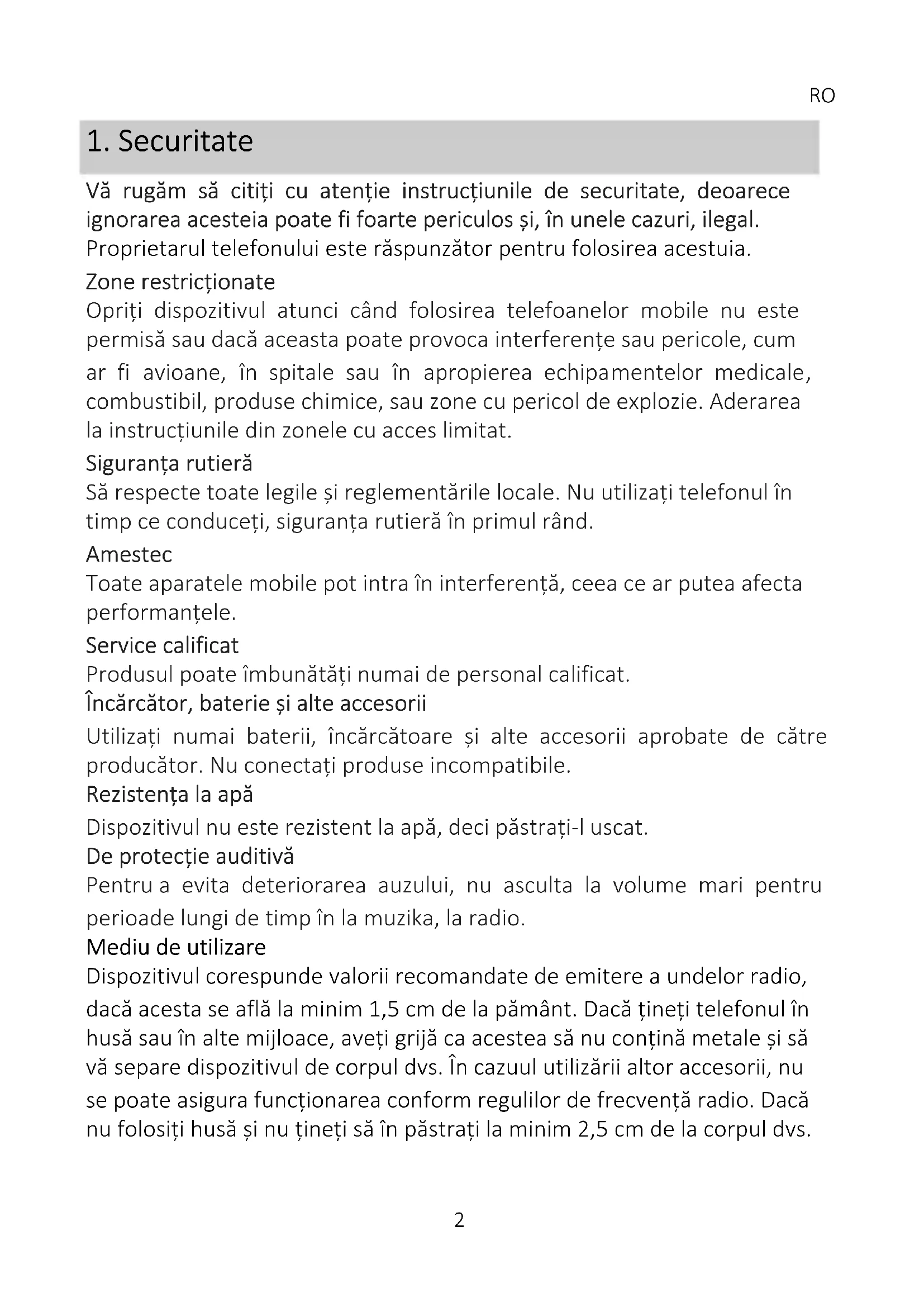 Vă rugăm să citiți cu atenție instrucțiunile de securitate, deoarece ignorarea acesteia poate fi foarte periculos și, în unele cazuri, ilegal. Proprietarul telefonului este răspunzător pentru folosirea acestuia. Zone restricționate Opriți dispozitivul atunci când folosirea telefoanelor mobile nu este permisă sau dacă aceasta poate provoca interferențe sau pericole, cum ar fi avioane, în spitale sau în apropierea echipamentelor medicale, combustibil, produse chimice, sau zone cu pericol de explozie. Aderarea la instrucțiunile din zonele cu acces limitat. Siguranța rutieră Să respecte toate legile și reglementările locale. Nu utilizați telefonul în timp ce conduceți, siguranța rutieră în primul rând. Amestec Toate aparatele mobile pot intra în interferență, ceea ce ar putea afecta performanțele. Service calificat Produsul poate îmbunătăți numai de personal calificat. Încărcător, baterie și alte accesorii Utilizați numai baterii, încărcătoare și alte accesorii aprobate de către producător. Nu conectați produse incompatibile. Rezistența la apă Dispozitivul nu este rezistent la apă, deci păstrați-l uscat. De protecție auditivă Pentru a evita deteriorarea auzului, nu asculta la volume mari pentru perioade lungi de timp în la muzika, la radio. Mediu de utilizare Dispozitivul corespunde valorii recomandate de emitere a undelor radio, dacă acesta se află la minim 1,5 cm de la pământ. Dacă țineți telefonul în husă sau în alte mijloace, aveți grijă ca acestea să nu conțină metale și să vă separe dispozitivul de corpul dvs. În cazuul utilizării altor accesorii, nu se poate asigura funcționarea conform regulilor de frecvență radio. Dacă nu folosiți husă și nu țineți să în păstrați la minim 2,5 cm de la corpul dvs.RO