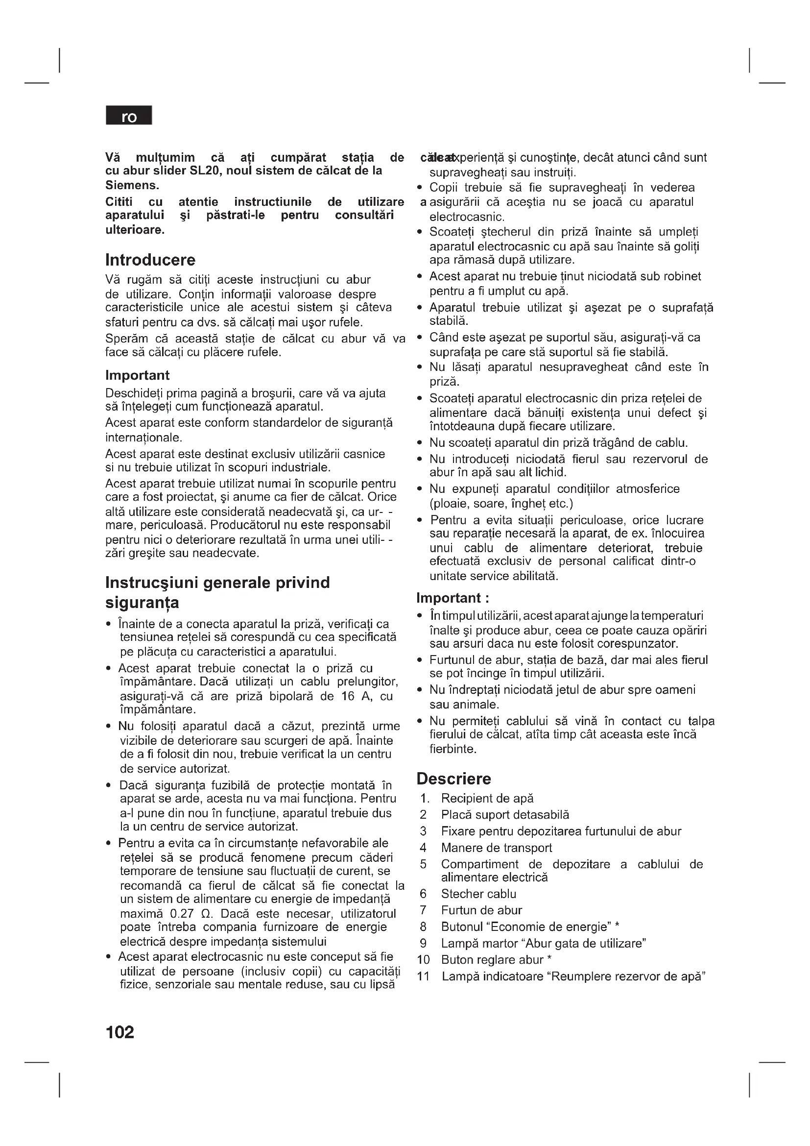 Vă mulţumim că aţi cumpărat staţia de călcat cuabursliderSL20,noulsistemdecălcatdela Siemens. Cititi cu atentie instructiunile de utilizare a aparatului şi păstrati-le pentru consultări ulterioare. Introducere Vă rugăm să citiţi aceste instrucţiuni cu abur de utilizare. Conţin informaţii valoroase despre caracteristicile unice ale acestui sistem şi câteva sfaturi pentru ca dvs. să călcaţi mai uşor rufele. Sperăm că această staţie de călcat cu abur vă va face să călcaţi cu plăcere rufele. Important Deschideţi prima pagină a broşurii, care vă va ajuta să înţelegeţi cum funcţionează aparatul. Acest aparat este conform standardelor de siguranţă internaţionale. Acest aparat este destinat exclusiv utilizării casnice si nu trebuie utilizat în scopuri industriale. Acest aparat trebuie utilizat numai în scopurile pentru care a fost proiectat, şi anume ca er de călcat. Orice altă utilizare este considerată neadecvată şi, ca ur-