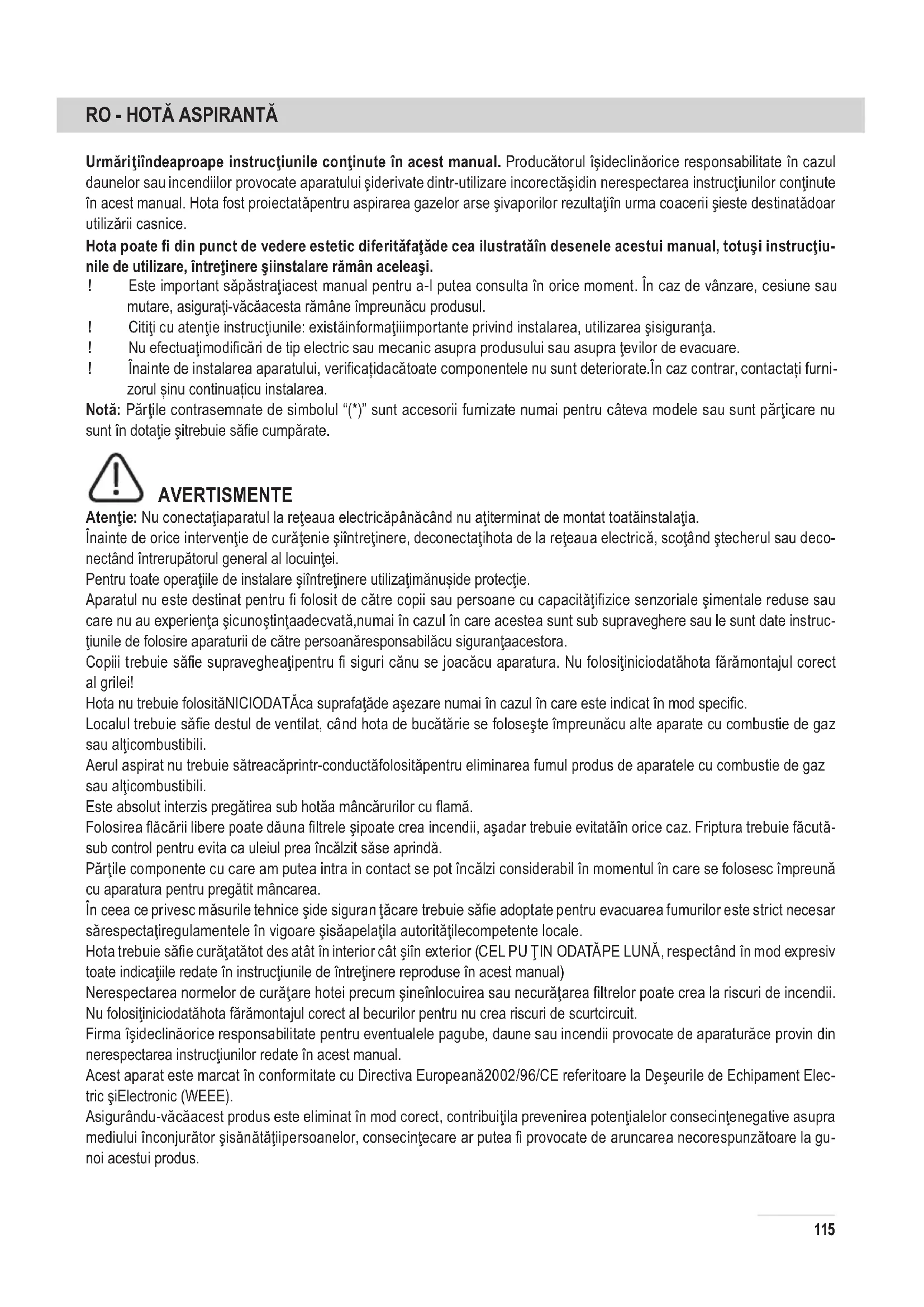 Urmăriţiîndeaproape instrucţiunile conţinute în acest manual. Producătorul îşideclinăorice responsabilitate în cazul daunelor sau incendiilor provocate aparatului şiderivate dintr-utilizare incorectăşidin nerespectarea instrucţiunilor conţinute în acest manual. Hota fost proiectatăpentru aspirarea gazelor arse şivaporilor rezultaţiîn urma coacerii şieste destinatădoar utilizării casnice. Hota poate din punct de vedere estetic diferităfaţăde cea ilustratăîn desenele acestui manual, totuşi instrucţiu- nile de utilizare, întreţinere şiinstalare rămân aceleaşi. ! Este important săpăstraţiacest manual pentru a-l putea consulta în orice moment. În caz de vânzare, cesiune sau mutare, asiguraţi-văcăacesta rămâne împreunăcu produsul. ! Citiţi cu atenţie instrucţiunile: existăinformaţiiimportante privind instalarea, utilizarea şisiguranţa. ! Nu efectuaţimodicări de tip electric sau mecanic asupra produsului sau asupra ţevilor de evacuare. ! Înainte de instalarea aparatului, vericațidacătoate componentele nu sunt deteriorate.În caz contrar, contactați furni- zorul șinu continuațicu instalarea. Notă: Părţile contrasemnate de simbolul “(*)” sunt accesorii furnizate numai pentru câteva modele sau sunt părţicare nu sunt în dotaţie şitrebuie săe cumpărate. AVERTISMENTE Atenţie: Nu conectaţiaparatul la reţeaua electricăpânăcând nu aţiterminat de montat toatăinstalaţia. Înainte de orice intervenţie de curăţenie şiîntreţinere, deconectaţihota de la reţeaua electrică, scoţând ştecherul sau deco- nectând întrerupătorul general al locuinţei. Pentru toate operaţiile de instalare şiîntreţinere utilizaţimănușide protecţie. Aparatul nu este destinat pentru folosit de către copii sau persoane cu capacităţizice senzoriale şimentale reduse sau care nu au experienţa şicunoştinţaadecvată,numai în cazul în care acestea sunt sub supraveghere sau le sunt date instruc- ţiunile de folosire aparaturii de către persoanăresponsabilăcu siguranţaacestora. Copiii trebuie săe supravegheaţipentru siguri cănu se joacăcu aparatura. Nu folosiţiniciodatăhota fărămontajul corect al grilei! Hota nu trebuie folosităNICIODATĂca suprafaţăde aşezare numai în cazul în care este indicat în mod specic. Localul trebuie săe destul de ventilat, când hota de bucătărie se foloseşte împreunăcu alte aparate cu combustie de gaz sau alţicombustibili. Aerul aspirat nu trebuie sătreacăprintr-conductăfolosităpentru eliminarea fumul produs de aparatele cu combustie de gaz sau alţicombustibili. Este absolut interzis pregătirea sub hotăa mâncărurilor cu amă. Folosirea ăcării libere poate dăuna ltrele şipoate crea incendii, aşadar trebuie evitatăîn orice caz. Friptura trebuie făcută- sub control pentru evita ca uleiul prea încălzit săse aprindă. Părţile componente cu care am putea intra in contact se pot încălzi considerabil în momentul în care se folosesc împreună cu aparatura pentru pregătit mâncarea. În ceea ce privesc măsurile tehnice şide siguran ţăcare trebuie săe adoptate pentru evacuarea fumurilor este strict necesar sărespectaţiregulamentele în vigoare şisăapelaţila autorităţilecompetente locale. Hota trebuie săe curăţatătot des atât în interior cât şiîn exterior (CEL PU ŢIN ODATĂPE LUNĂ, respectând în mod expresiv toate indicaţiile redate în instrucţiunile de întreţinere reproduse în acest manual) Nerespectarea normelor de curăţare hotei precum şineînlocuirea sau necurăţarea ltrelor poate crea la riscuri de incendii. Nu folosiţiniciodatăhota fărămontajul corect al becurilor pentru nu crea riscuri de scurtcircuit. Firma îşideclinăorice responsabilitate pentru eventualele pagube, daune sau incendii provocate de aparaturăce provin din nerespectarea instrucţiunilor redate în acest manual. Acest aparat este marcat în conformitate cu Directiva Europeană2002/96/CE referitoare la Deşeurile de Echipament Elec- tric şiElectronic (WEEE). Asigurându-văcăacest produs este eliminat în mod corect, contribuiţila prevenirea potenţialelor consecinţenegative asupra mediului înconjurător şisănătăţiipersoanelor, consecinţecare ar putea provocate de aruncarea necorespunzătoare la gu- noi acestui produs.116 S i m b o l u l de pe produs, sau de pe documentele care însoţesc produsul, indicăfaptul căacesta nu poate aruncat împreunăcu deşeurile menajere. Trebuie predat la punctul de colectare corespunzător, pentru reciclarea echipa- mentului electric şielectronic. Aruncarea la gunoi aparatului trebuie făcutăîn conformitate cu normele locale pentru eliminarea deşeurilor. Pentru informaţii mai detaliate privind eliminarea, valoricarea şi reciclarea acestui produs, vărugăm săcontactaţi adminis- traţia locală,serviciul de eliminare deşeurilor menajere sau magazinul de unde aţicumpărat produsul. Aparat proiectat, testat şifabricat în conformitate cu:
