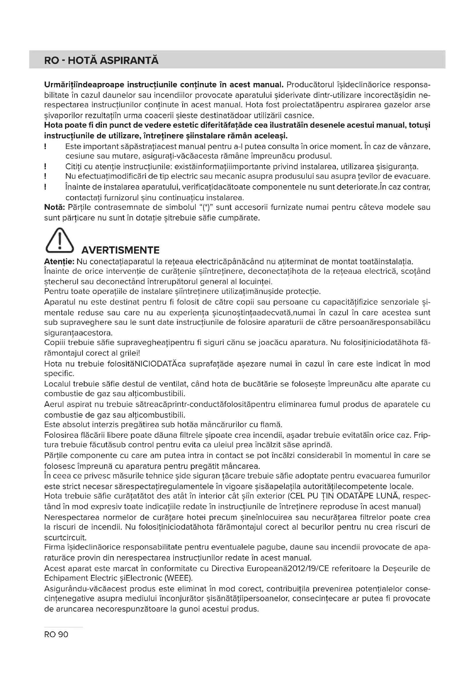 Urmăriţiîndeaproape instrucţiunile conţinute în acest manual. Producătorul îşideclinăorice responsa- bilitate în cazul daunelor sau incendiilor provocate aparatului şiderivate dintr-utilizare incorectăşidin ne- respectarea instrucţiunilor conţinute în acest manual. Hota fost proiectatăpentru aspirarea gazelor arse şivaporilor rezultaţiîn urma coacerii şieste destinatădoar utilizării casnice. Hota poate fi din punct de vedere estetic diferităfaţăde cea ilustratăîn desenele acestui manual, totuşi instrucţiunile de utilizare, întreţinere şiinstalare rămân aceleaşi. ! Este important săpăstraţiacest manual pentru a-l putea consulta în orice moment. În caz de vânzare, cesiune sau mutare, asiguraţi-văcăacesta rămâne împreunăcu produsul. ! Citiţi cu atenţie instrucţiunile: existăinformaţiiimportante privind instalarea, utilizarea şisiguranţa. ! Nu efectuaţimodificări de tip electric sau mecanic asupra produsului sau asupra ţevilor de evacuare. ! Înainte de instalarea aparatului, verificaţidacătoate componentele nu sunt deteriorate.În caz contrar, contactaţi furnizorul şinu continuaţicu instalarea. Notă: Părţile contrasemnate de simbolul “(*)” sunt accesorii furnizate numai pentru câteva modele sau sunt părţicare nu sunt în dotaţie şitrebuie săfie cumpărate. AVERTISMENTE Atenţie: Nu conectaţiaparatul la reţeaua electricăpânăcând nu aţiterminat de montat toatăinstalaţia. Înainte de orice intervenţie de curăţenie şiîntreţinere, deconectaţihota de la reţeaua electrică, scoţând ştecherul sau deconectând întrerupătorul general al locuinţei. Pentru toate operaţiile de instalare şiîntreţinere utilizaţimănuşide protecţie. Aparatul nu este destinat pentru fi folosit de către copii sau persoane cu capacităţifizice senzoriale şi- mentale reduse sau care nu au experienţa şicunoştinţaadecvată,numai în cazul în care acestea sunt sub supraveghere sau le sunt date instrucţiunile de folosire aparaturii de către persoanăresponsabilăcu siguranţaacestora. Copiii trebuie săfie supravegheaţipentru fi siguri cănu se joacăcu aparatura. Nu folosiţiniciodatăhota fă- rămontajul corect al grilei! Hota nu trebuie folosităNICIODATĂca suprafaţăde aşezare numai în cazul în care este indicat în mod specific. Localul trebuie săfie destul de ventilat, când hota de bucătărie se foloseşte împreunăcu alte aparate cu combustie de gaz sau alţicombustibili. Aerul aspirat nu trebuie sătreacăprintr-conductăfolosităpentru eliminarea fumul produs de aparatele cu combustie de gaz sau alţicombustibili. Este absolut interzis pregătirea sub hotăa mâncărurilor cu flamă. Folosirea flăcării libere poate dăuna filtrele şipoate crea incendii, aşadar trebuie evitatăîn orice caz. Frip- tura trebuie făcutăsub control pentru evita ca uleiul prea încălzit săse aprindă. Părţile componente cu care am putea intra in contact se pot încălzi considerabil în momentul în care se folosesc împreună cu aparatura pentru pregătit mâncarea. În ceea ce privesc măsurile tehnice şide siguran ţăcare trebuie săfie adoptate pentru evacuarea fumurilor este strict necesar sărespectaţiregulamentele în vigoare şisăapelaţila autorităţilecompetente locale. Hota trebuie săfie curăţatătot des atât în interior cât şiîn exterior (CEL PU ŢIN ODATĂPE LUNĂ, respec- tând în mod expresiv toate indicaţiile redate în instrucţiunile de întreţinere reproduse în acest manual) Nerespectarea normelor de curăţare hotei precum şineînlocuirea sau necurăţarea filtrelor poate crea la riscuri de incendii. Nu folosiţiniciodatăhota fărămontajul corect al becurilor pentru nu crea riscuri de scurtcircuit. Firma îşideclinăorice responsabilitate pentru eventualele pagube, daune sau incendii provocate de apa- raturăce provin din nerespectarea instrucţiunilor redate în acest manual. Acest aparat este marcat în conformitate cu Directiva Europeană2012/19/CE referitoare la Deşeurile de Echipament Electric şiElectronic (WEEE). Asigurându-văcăacest produs este eliminat în mod corect, contribuiţila prevenirea potenţialelor conse- cinţenegative asupra mediului înconjurător şisănătăţiipersoanelor, consecinţecare ar putea fi provocate de aruncarea necorespunzătoare la gunoi acestui produs.RO91 Simbolul de pe produs, sau de pe documentele care însoţesc produsul, indicăfaptul căacesta nu poate fi aruncat împreunăcu deşeurile menajere. Trebuie predat la punctul de colectare cores- punzător, pentru reciclarea echipamentului electric şielectronic. Aruncarea la gunoi aparatului trebuie făcutăîn conformitate cu normele locale pentru eliminarea deşeurilor. Pentru informaţii mai detaliate privind eliminarea, valorificarea şi reciclarea acestui produs, vărugăm să- contactaţi administraţia locală,serviciul de eliminare deşeurilor menajere sau magazinul de unde aţicum- părat produsul. Aparat proiectat, testat şifabricat în conformitate cu:
