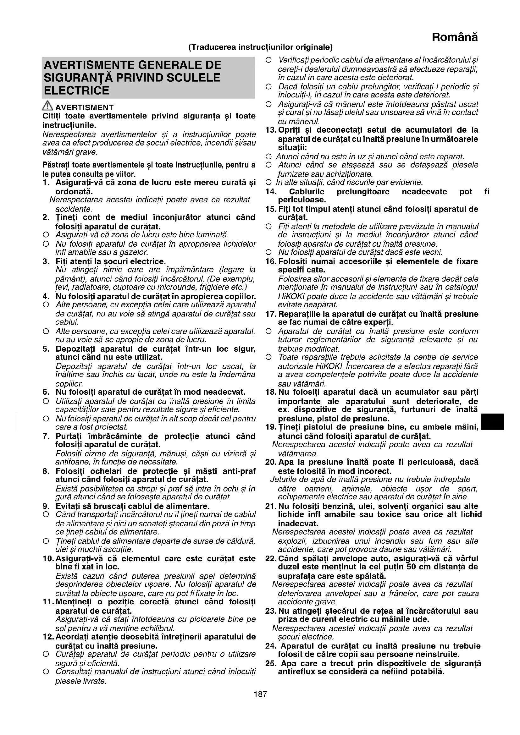 se fac numai de către experţi. ○ Aparatul de curăţat cu înaltă presiune este conform tuturor reglementărilor de siguranţă relevante și nu trebuie modifi cat. ○ Toate reparaţiile trebuie solicitate la centre de service autorizate HiKOKI. Încercarea de a efectua reparaţii fără a avea competenţele potrivite poate duce la accidente sau vătămări.