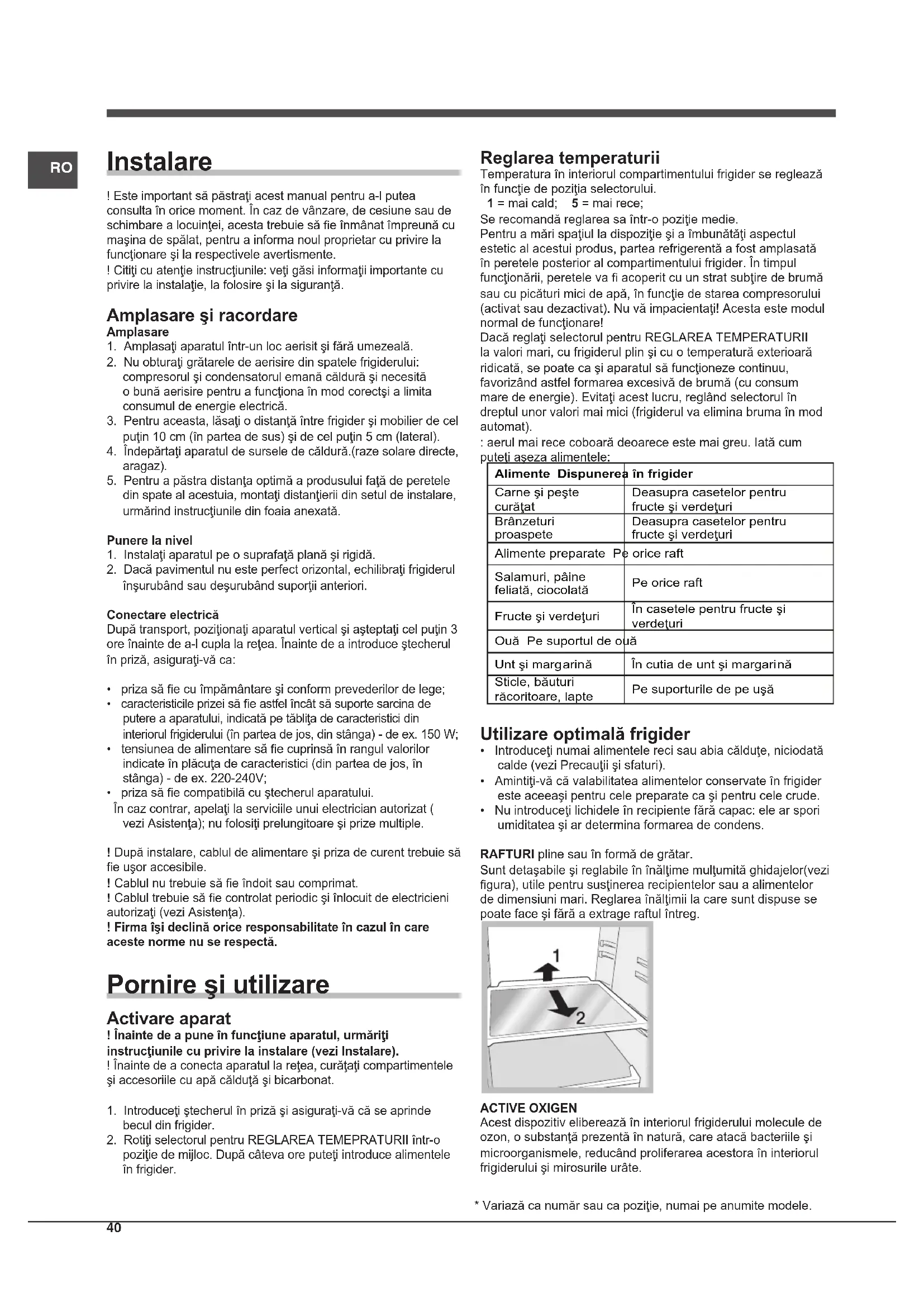 - Introduceţi numai alimentele reci sau abia călduţe, niciodată calde (vezi Precauţii şi sfaturi).• Amintiţi-vă că valabilitatea alimentelor conservate în frigider este aceeaşi pentru cele preparate ca şi pentru cele crude.• Nu introduceţi lichidele în recipiente fără capac: ele ar spori umiditatea şi ar determina formarea de condens.RAFTURI pline sau în formă de grătar. Sunt detaşabile şi reglabile în înălţime mulţumită ghidajelor(vezi gura), utile pentru susţinerea recipientelor sau a alimentelor de dimensiuni mari. Reglarea înălţimii la care sunt dispuse se poate face şi fără a extrage raftul întreg.ACTIVE OXIGENAcest dispozitiv eliberează în interiorul frigiderului molecule de ozon, o substanţă prezentă în natură, care atacă bacteriile şi microorganismele, reducând proliferarea acestora în interiorul frigiderului şi mirosurile urâte.* Variază ca număr sau ca poziţie, numai pe anumite modele.RO