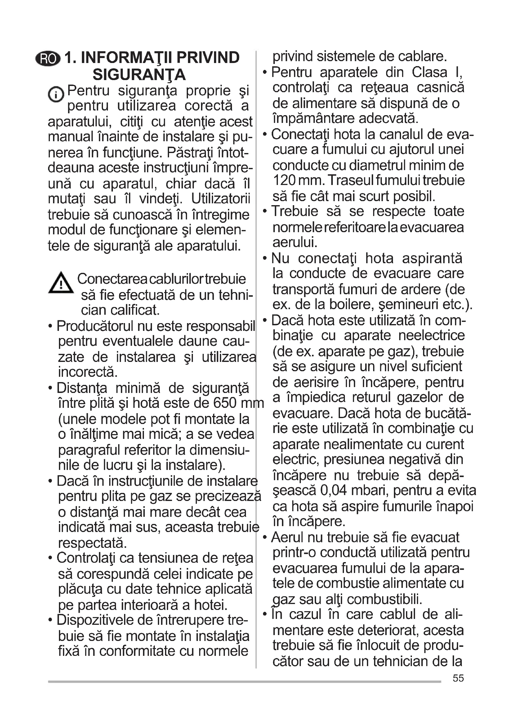 - Для заміни звертайтесь в технічну під- тримку («Для придбання звертайтесь в технічну підтримку»).55 1.INFORMAŢIIPRIVIND SIGURANŢA Pentru siguranţa proprie şi pentru utilizarea corectă a aparatului, citiţi cu atenţie acest manual înainte de instalare şi pu- nerea în funcţiune. Păstraţi întot- deauna aceste instrucţiuni împre- ună cu aparatul, chiar dacă îl mutaţi sau îl vindeţi. Utilizatorii trebuie să cunoască în întregime modul de funcţionare şi elemen- tele de siguranţă ale aparatului. Conectarea cablurilor trebuie să e efectuată de un tehni- cian calicat.
