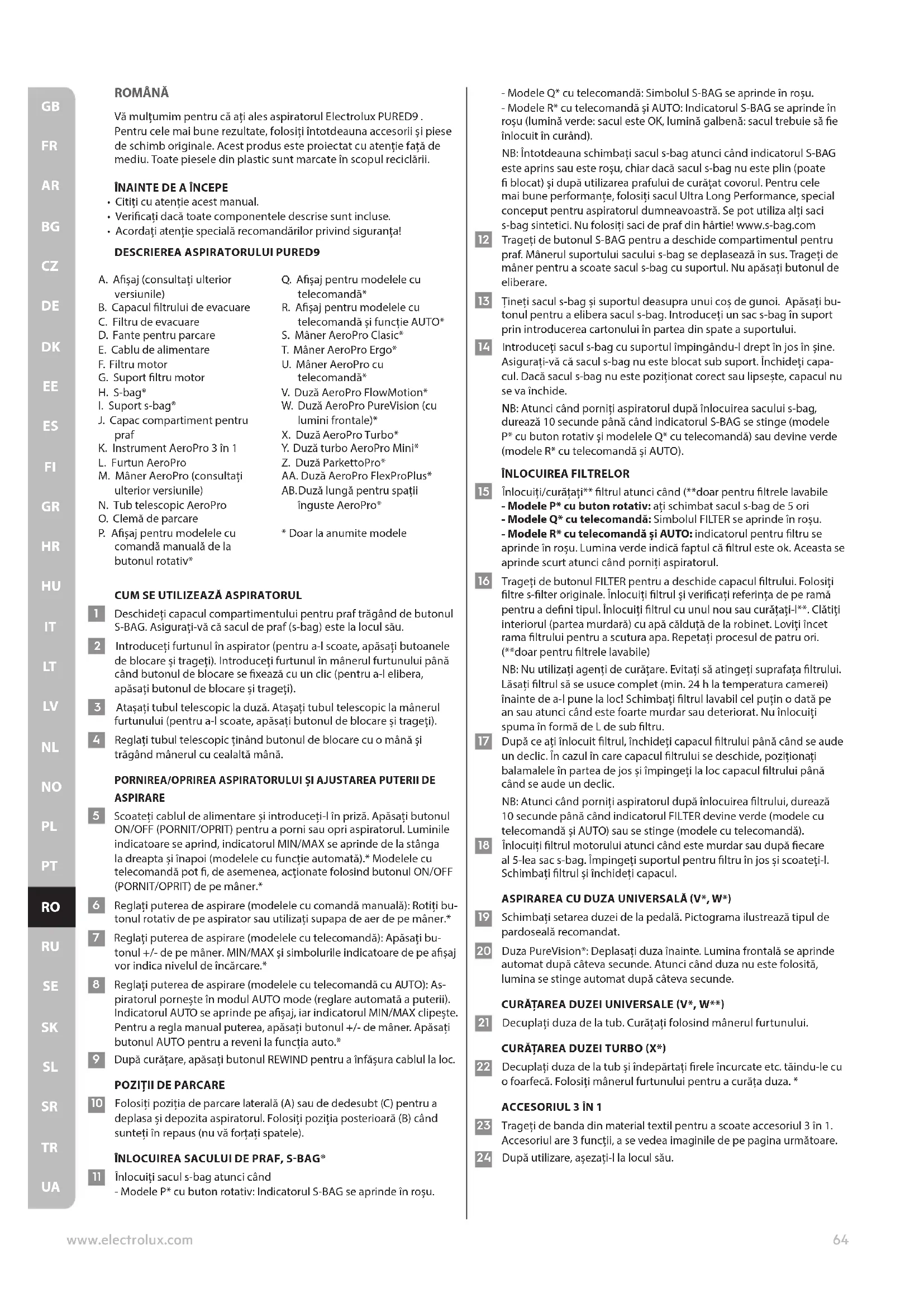 UAROMÂNĂ Vă mulțumim pentru că ați ales aspiratorul Electrolux PURED9 . Pentru cele mai bune rezultate, folosiți întotdeauna accesorii și piese de schimb originale. Acest produs este proiectat cu atenție față de mediu. Toate piesele din plastic sunt marcate în scopul reciclării.