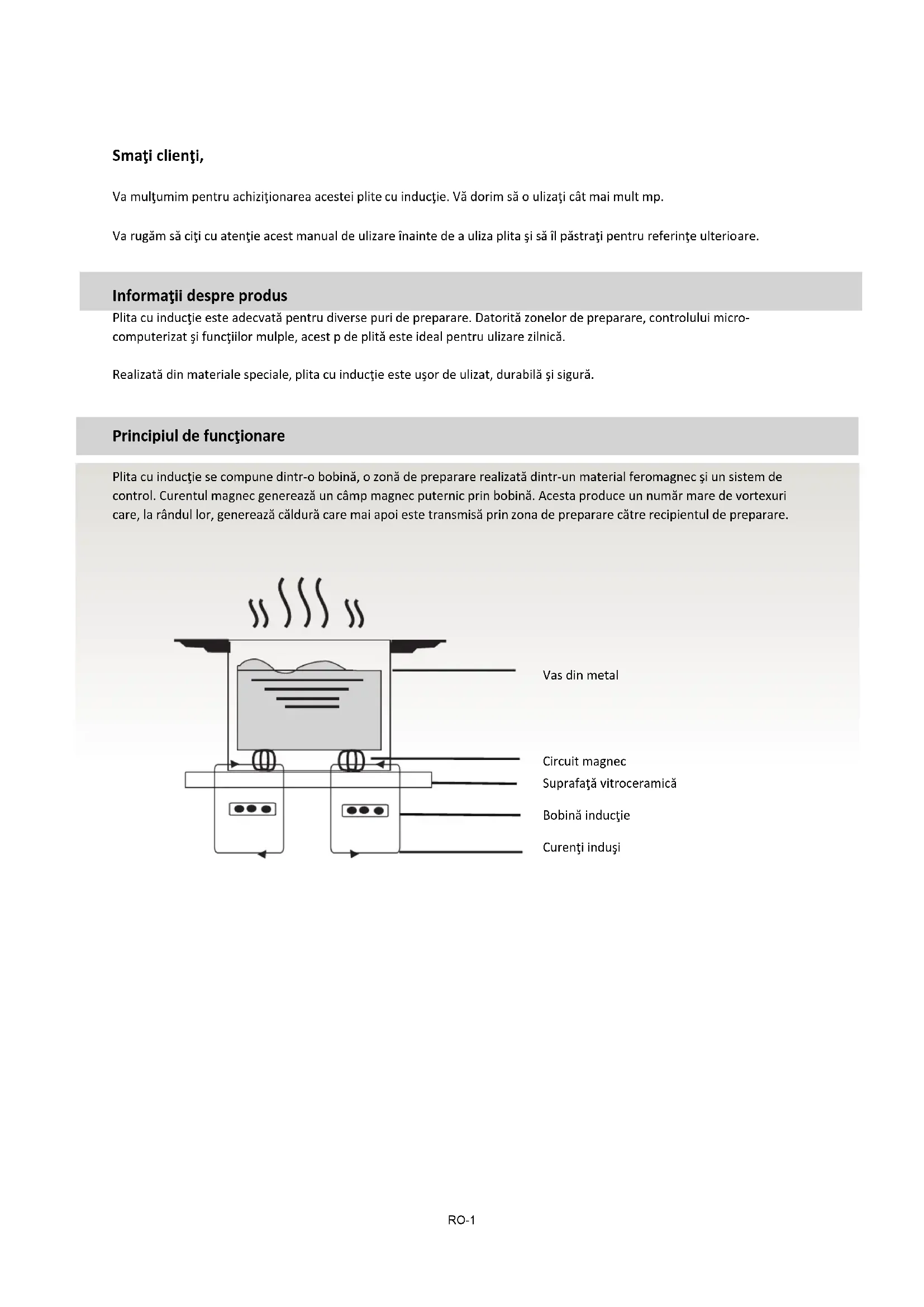 Vas din metal Circuit magnetic Suprafaţă vitroceramică Bobină inducţie Curenţi induşi RO-1Siguranţa Această plită este special realizată pentru uz casnic. În încercarea constantă de îmbunătăţire a produselor, ne rezervăm dreptul de a modifica orice specificaţii tehnice, programe sau aspecte estetice ale aparatului, în orice moment. Protecţia la supraîncălzire Un senzor monitorizează temperatura pentru zonele de preparare. Când temperatura depăşeşte nivelul de siguranţă, zona de preparare se opreşte automat. Detectarea obiectelor mici sau non-magnetice Dacă lăsaţi pe plită un vas cu diametrul mai mic de 80 mm sau alte obiecte de dimensiuni mici (ex. cuţit, furculiţă, cheie) sau un vas non-magnetic (ex. din aluminiu), se aude o alarmă sonoră timp de circa un minut, după care plita trece în moad automat în standby. Avertizare căldură remanentă După ce plita funcţionează o anumită perioadă de timp, se acumulează căldură. Apare litera „H” pentru a vă atenţiona asupra faptului că zona de preparare este caldă. Oprire automată O altă caracteristică de siguranţă a plitei cu inducţie este oprirea automată. Aceasta se activează în momentul în care uitaţi să opriţi funcţionarea unei zone de preparare. Duratele de timp după care funcţionarea plitei se opreşte automat sunt menţionate în tabelul de mai jos: Nivel de putere Durata de timp după care zona de preparare se opreşte automat 1-5 8 ore 6-10 4 ore 11-14 2 ore