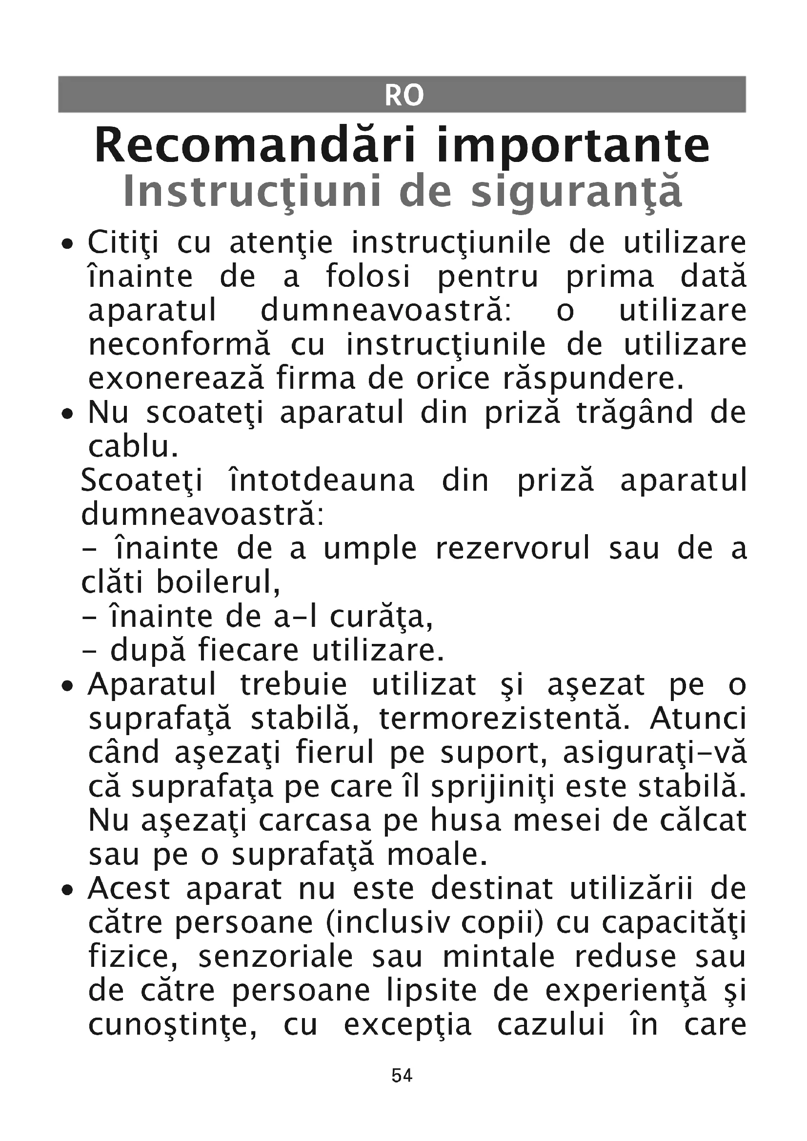 - Nu scufundaţi niciodată staţia dumneavoastră de călcat cu aburi în apă sau în alt lichid. Nu o treceţi niciodată sub un jet de apă de la robinet. VĂ RUGĂM SĂ PĂSTRAŢI ACESTE