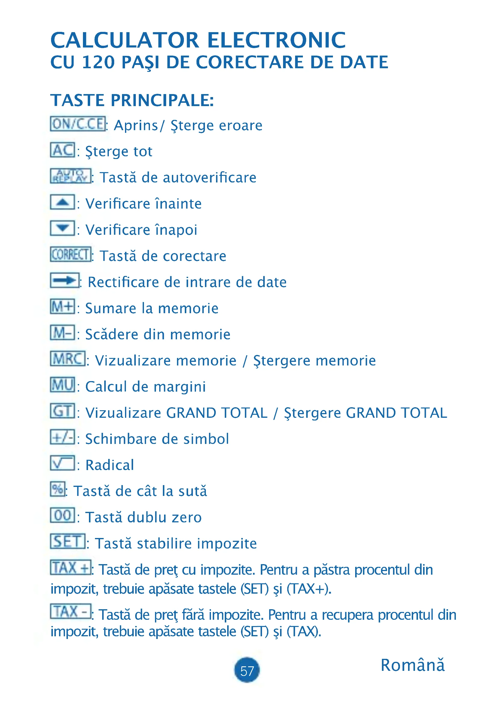 . F : Virgulă decimală.volatilă . 4.2.0 : Numǎr de poziţii decimale . A : Indicǎ cǎ numǎrul de decimale se situeazǎ automatic în 2 (de exemplu, dacǎ apasǎ 8, valoarea este 0,08, dar dacǎ se apasǎ “.” aceastǎ poziţie este baza). Aceastǎ caracteristicǎ este efectivǎ doar pentru adunare şi scǎdere. DESCRIERE A ECRANULUI LCD: GT : Simbolul de Memorie Independientǎ, indicǎ cǎ Memoria Independientǎ este activǎ. M : Simbolul de Memorie Independientǎ, indicǎ cǎ Memoria Independientǎ este activǎ. - : Simbolul negativ. E : Simbol de eroare, când ecranul indicǎ “E” poate apăsa pentru a şterge eroarea.59 OPERAŢIE Vericare şi corectare