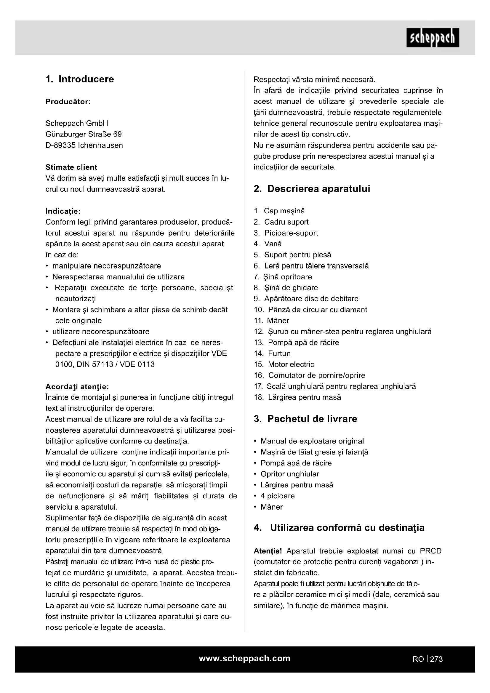 - Defecțiuni ale instalaţiei electrice în caz de neres- pectare a prescripţiilor electrice şi dispoziţiilor VDE 0100, DIN 57113 / VDE 0113 Acordaţi atenţie: Înainte de montajul şi punerea în funcţiune citiţi întregul text al instrucţiunilor de operare. Acest manual de utilizare are rolul de a vă facilita cu- noaşterea aparatului dumneavoastră şi utilizarea posi- bilităţilor aplicative conforme cu destinaţia. Manualul de utilizare conține indicații importante pri- vind modul de lucru sigur, în conformitate cu prescripți- ile și economic cu aparatul și cum să evitați pericolele, să economisiți costuri de reparație, să micșorați timpii de nefuncționare și să măriți abilitatea și durata de serviciu a aparatului. Suplimentar față de dispozițiile de siguranță din acest manual de utilizare trebuie să respectați în mod obliga- toriu prescripțiile în vigoare referitoare la exploatarea aparatului din țara dumneavoastră. Păstraţi manualul de utilizare într-o husă de plastic pro- tejat de murdărie şi umiditate, la aparat. Acestea trebu- ie citite de personalul de operare înainte de începerea lucrului şi respectate riguros. La aparat au voie să lucreze numai persoane care au fost instruite privitor la utilizarea aparatului şi care cu- nosc pericolele legate de aceasta.www.scheppach.com