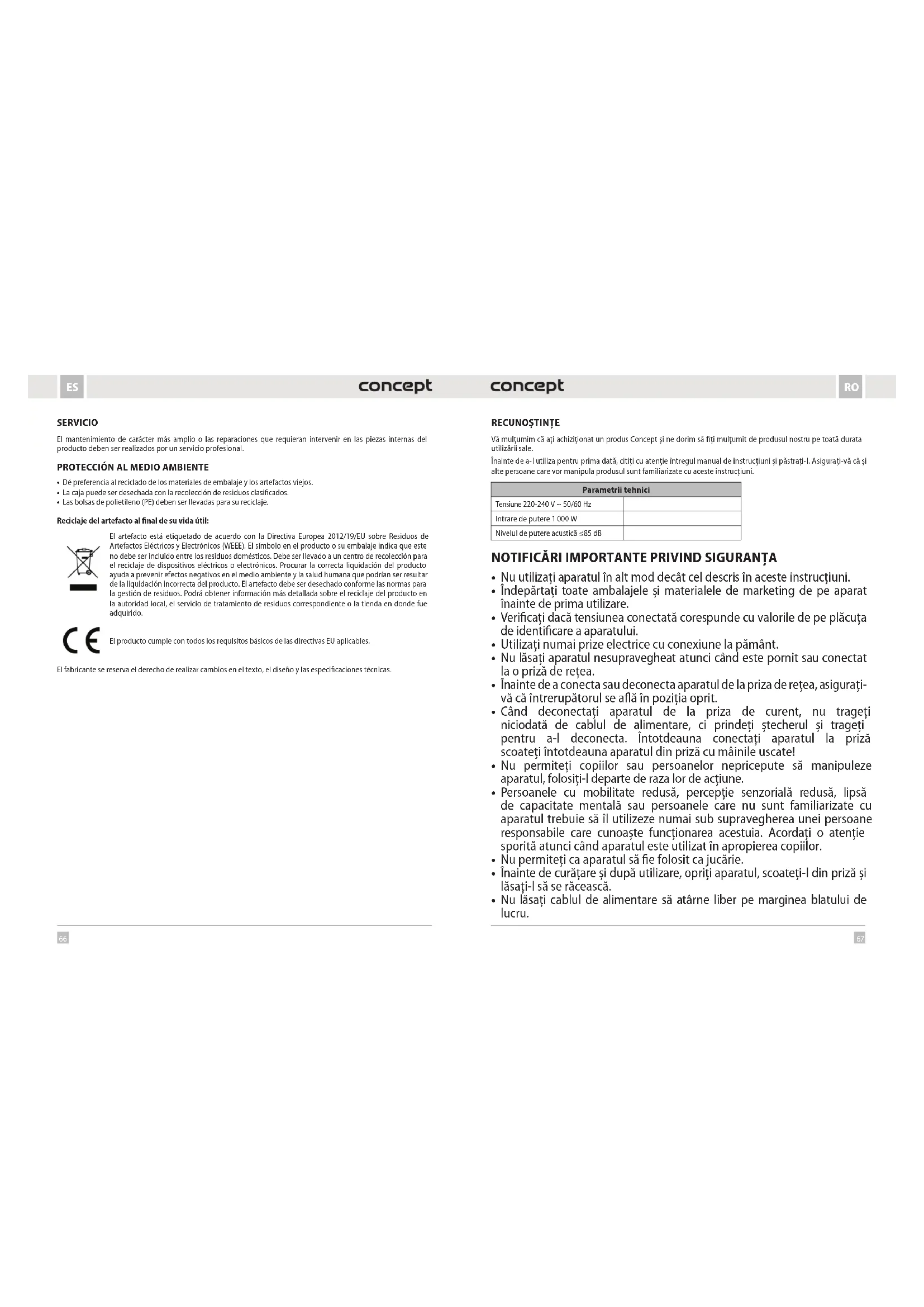 Vă mulțumim că ați achiziționat un produs Concept și ne dorim să fiți mulțumit de produsul nostru pe toată durata utilizării sale. Înainte de a-l utiliza pentru prima dată, citiți cu atenție întregul manual de instrucțiuni și păstrați-l. Asigurați-vă că și alte persoane care vor manipula produsul sunt familiarizate cu aceste instrucțiuni.68 69 RORO