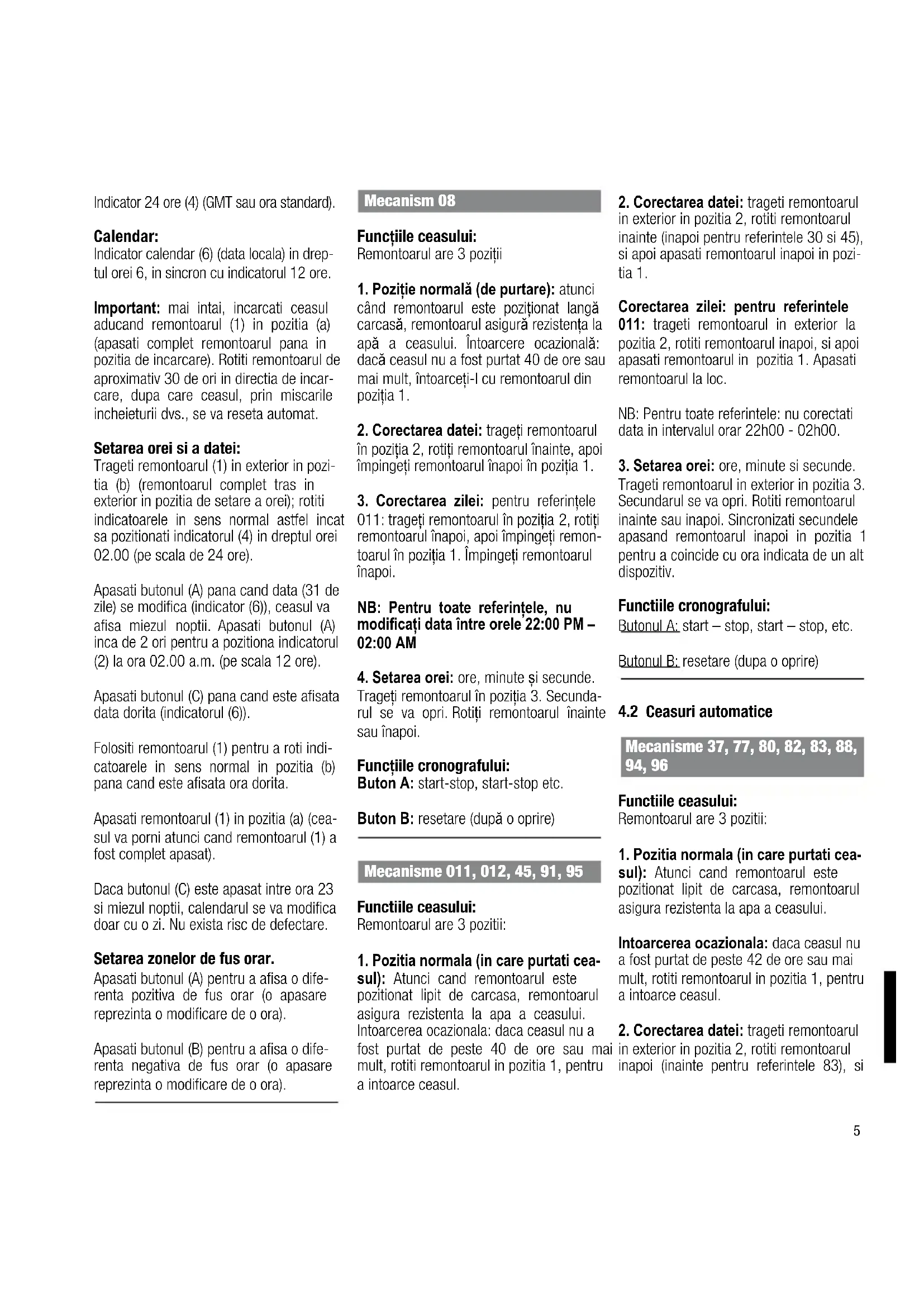 Trageți remontoarul în poziția 3. Secunda- rul se va opri. Rotiți remontoarul înainte sau înapoi. Funcțiile cronografului: Buton A: start-stop, start-stop etc. Buton B: resetare (după o oprire) Mecanisme 011, 012, 45, 91, 95 Functiile ceasului: Remontoarul are 3 pozitii: