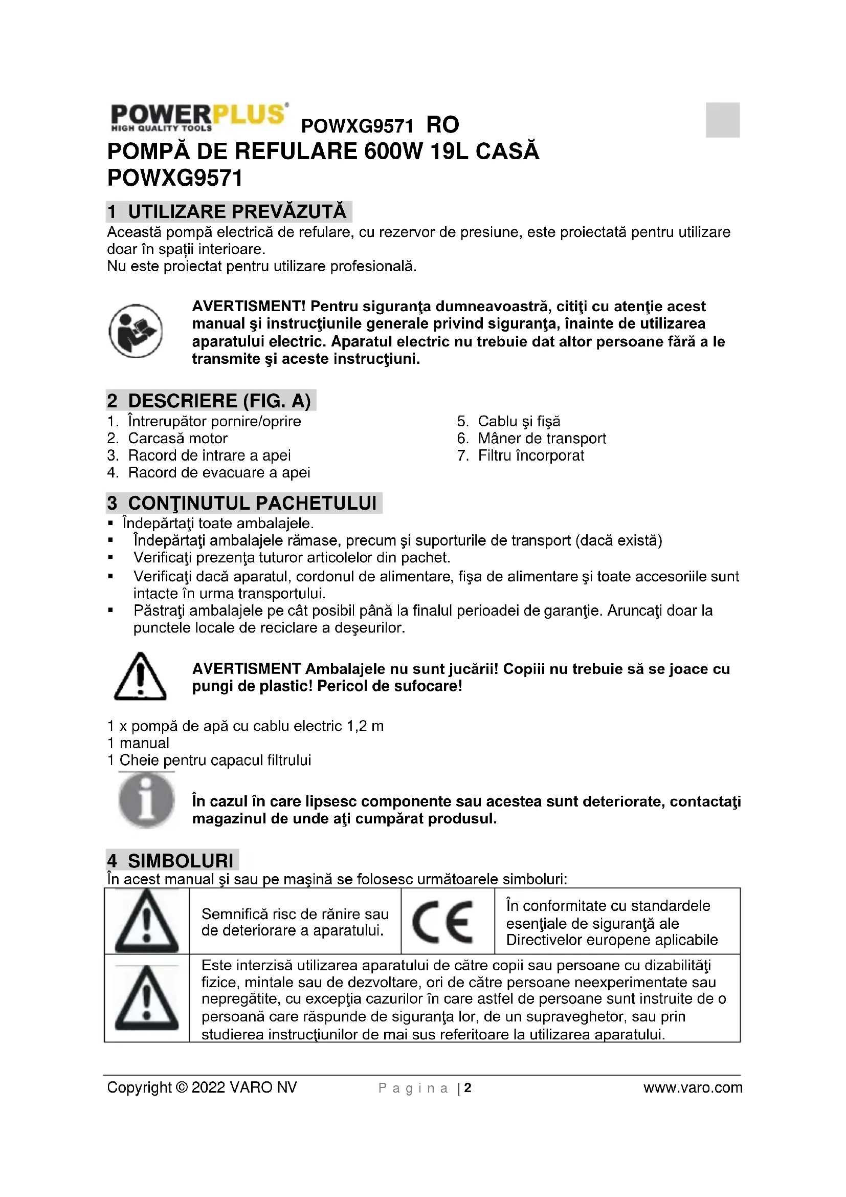 - În caz de probleme cu pompa, reparaţiile în garanţie trebuie efectuate de un centru de service autorizat. Nu folosiţi solvenţi precum petrol, alcool, apă amoniacală, etc. Aceşti solvenţi pot deteriora componentele de plastic. 9 DATE TEHNICE Tip POWXG9571 Tensiune / frecvenţă 230V~ /50Hz Puterea la intrare 600W Capacitate maximă de pompare 3000 l/oră Înălţime maximă de pompare 30 m Înălţime maximă de aspiraţie 7 m Temperatură maximă a apei 35°C Min. diametrul minim al furtunului de aspiraţie 1” (25 mm) Min. diametrul minim al furtunului de presiune 3/4” (20 mm) Lungimea cablului 1,2 m Presiune nominală 0,35 mPa –3,5 bar Clasă de protecţie la int. IPX4 Greutate 11,56 kg Adecvat pentru Apă curată Capacitatea rezervorului de presiune 19L Materialul corpului pompei / rezervorului PP / Metal 10 ZGOMOT Valori ale emisiilor sonore măsurate în conformitate cu standardele aplicabile. (K=3) Nivel de presiune acustică LpA 68 dB(A) Nivel de putere acustică LwA 81 dB(A) ATENŢIE! Presiunea acustică poate depăşi 85 dB(A), caz în care trebuie purtat un dispozitiv de protecţie auditivă. 11 DEPANAREA Problemă Cauză Soluţie Motorul electric funcţionează, dar pompa nu aspiră apă După pornirea pompei, corpul pompei nu se umple cu apă. Umpleţi pompa cu apă. Furtunul de aspiraţie nu este suficient de etanş. Verificaţi planurile şi componentele recomandate şi utilizate ale pompei, de ex. racordul duzei de aspiraţie, racordul furtunului de presiune, colier, furtun de aspiraţie etc., inclusiv banda de etanşare din teflon sau cânepa pentru filet. . Pompa funcţionează numai dacă este etanşată corespunzător.POWXG9571 RO Copyright © 2022 VARO NV P a g i n a | 6 www.varo.com Problemă Cauză Soluţie Sita de filtrare a supapei anti-retur a racordului de intrare este înfundată. Curăţaţi supapa anti-retur a racordului de intrare şi sita de filtrare. Aerul nu iese din furtunul de presiune, deoarece racordul de ieşire a apei este închis. Când pompa începe să aspire, deschideţi racordul de ieşire a apei (de ex. robinetul, aspersorul etc.). Timpul de amorsare nu este conform reglementărilor. Umpleţi furtunul de aspiraţie cu apă sau verificaţi din nou după cel puţin 7 minute de la pornirea pompei. Înălţime de aspiraţie prea mare (> 8 m). Reduceţi înălţimea de aspiraţie. Supapa anti-retur nu aspiră apă. Verificaţi nivelul apei în puţ sau în bazinul de apă. Dacă este posibil, prelungiţi furtunul de aspiraţie. Electromotorul nu funcţionează. Nu este alimentat cu energie. Verificaţi alimentarea cu energie. Capacul elicei blochează rotorul. Deconectaţi fişa de alimentare, scoateţi capacul rotorului cu ajutorul unei şurubelniţe, apoi montaţi-l la loc rotind uşor rotorul şi verificaţi dacă se roteşte liber. Elicea este blocată. Deconectaţi fişa de alimentare, deplasaţi axul cu ajutorul unei şurubelniţe în butucul elicei. Dacă axul este blocat, trimiteţi pompa la un centru de service pentru verificări. Debitul de apă pompat este insuficient. Înălţime de aspiraţie prea mare (> 8 m). Verificaţi înălţimea de aspiraţie. Sita de filtrare a supapei anti-retur este înfundată. Curăţaţi sita de filtrare. Nivelul apei aspirate a scăzut prea mult. Introduceţi mai adânc în apă supapa anti-retur. Impurităţile au redus capacitatea reală a pompei. Spălaţi cu apă sub presiune corpul pompei, furtunul de aspiraţie şi furtunul de presiune pentru evacuare. Întrerupătorul de protecţie la supraîncălzire nu opreşte pompa. Supraîncărcarea motorului electric din cauza frecării provocate de impurităţile care pătrund în motor. Spălaţi corpul pompei cu apă sub presiune. Întrerupătorul pompei este în permanenţă în poziţia OPRIT sau PORNIT. Supapa anti-retur nu este montată pe furtunul de aspiraţie. Verificaţi montarea supapei pe furtunul de aspiraţie.POWXG9571 RO Copyright © 2022 VARO NV P a g i n a | 7 www.varo.com Problemă Cauză Soluţie Întrerupătorul comută prea frecvent între poziţiile PORNIT / OPRIT (la utilizarea pentru alimentarea cu apă a locuinţelor). Învelişul din cauciuc din rezervorul de presiune este rupt. Înlocuiţi învelişul din cauciuc sau rezervorul. Lipsa aerului comprimat din rezervor. Utilizaţi o supapă corespunzătoare şi racordaţi la o sursă de aer comprimat de 1,8 bar; alimentaţi rezervorul cu aer comprimat. 12 GARANŢIE