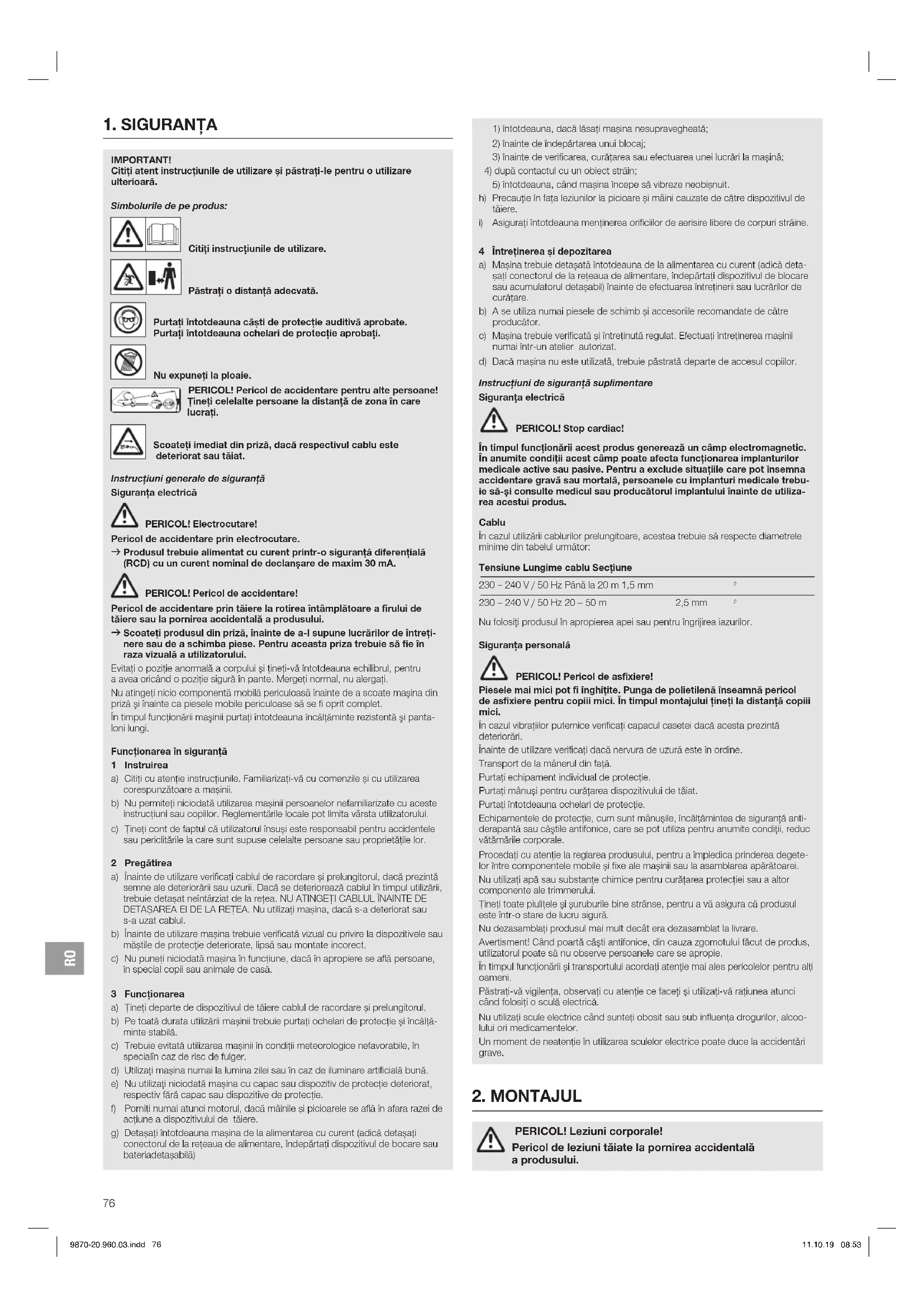 PERICOL! Leziuni corporale! Pericol de leziuni tăiate la pornirea accidentală a produsului. 9870-20.960.03.indd 76 11.10.19 08:53RO